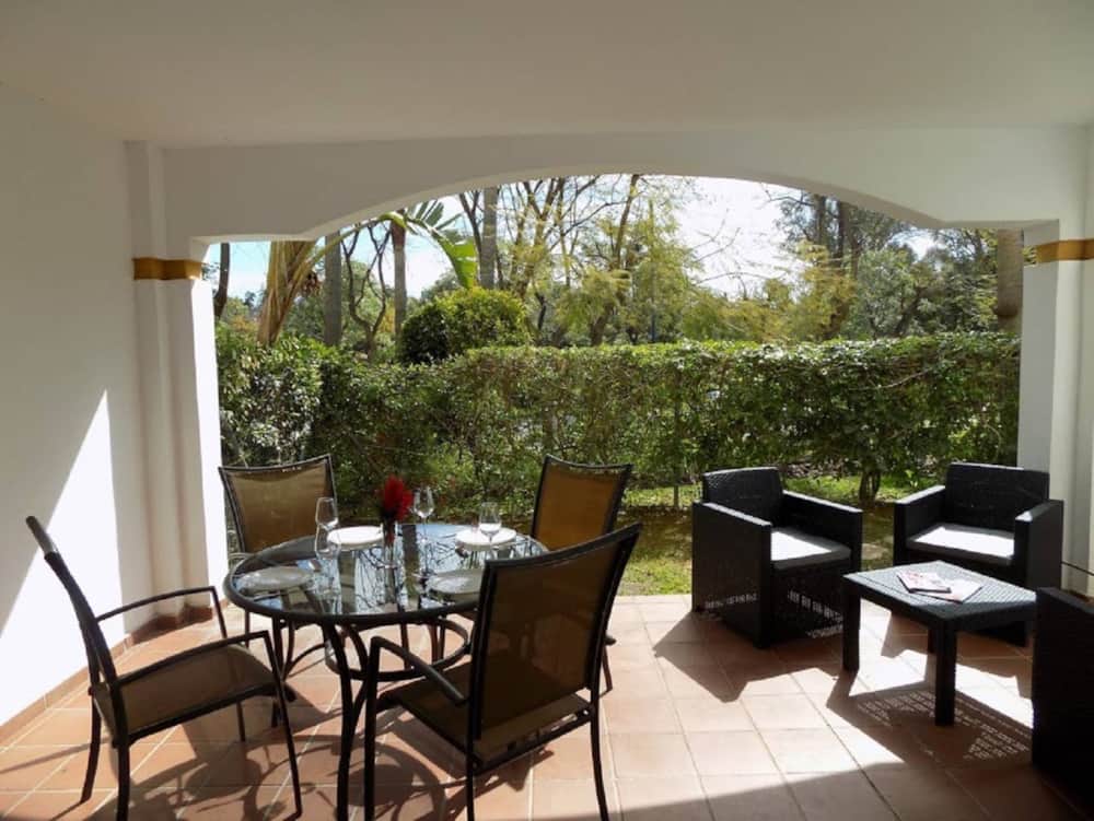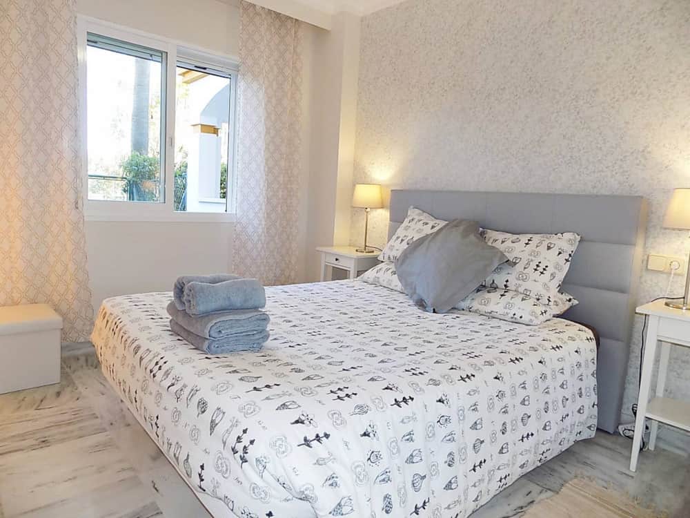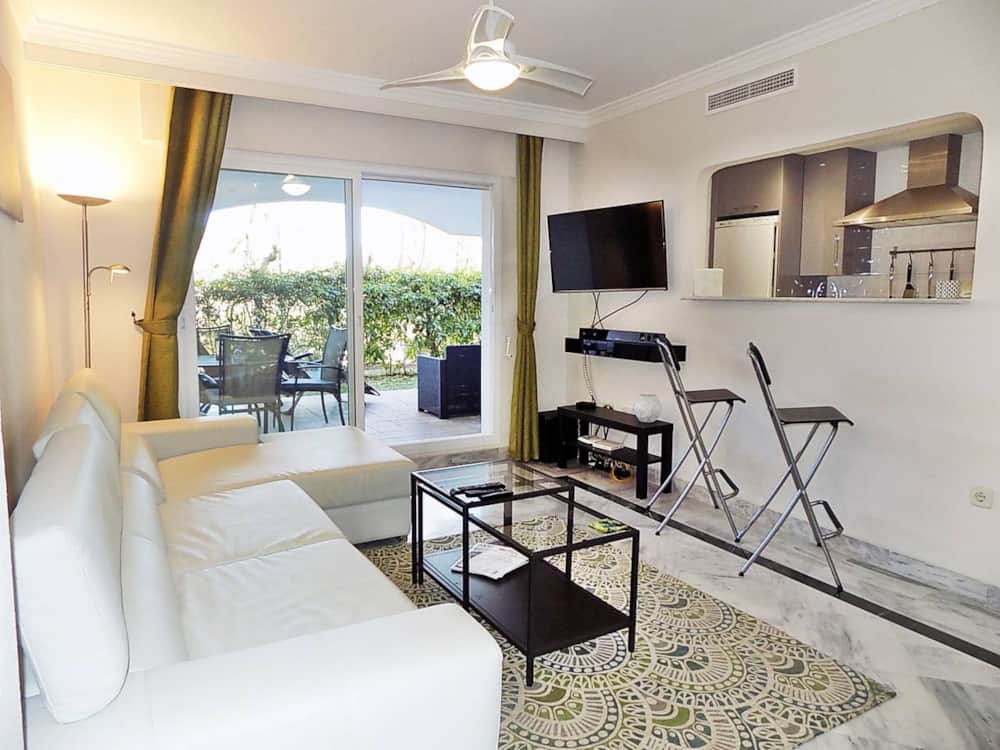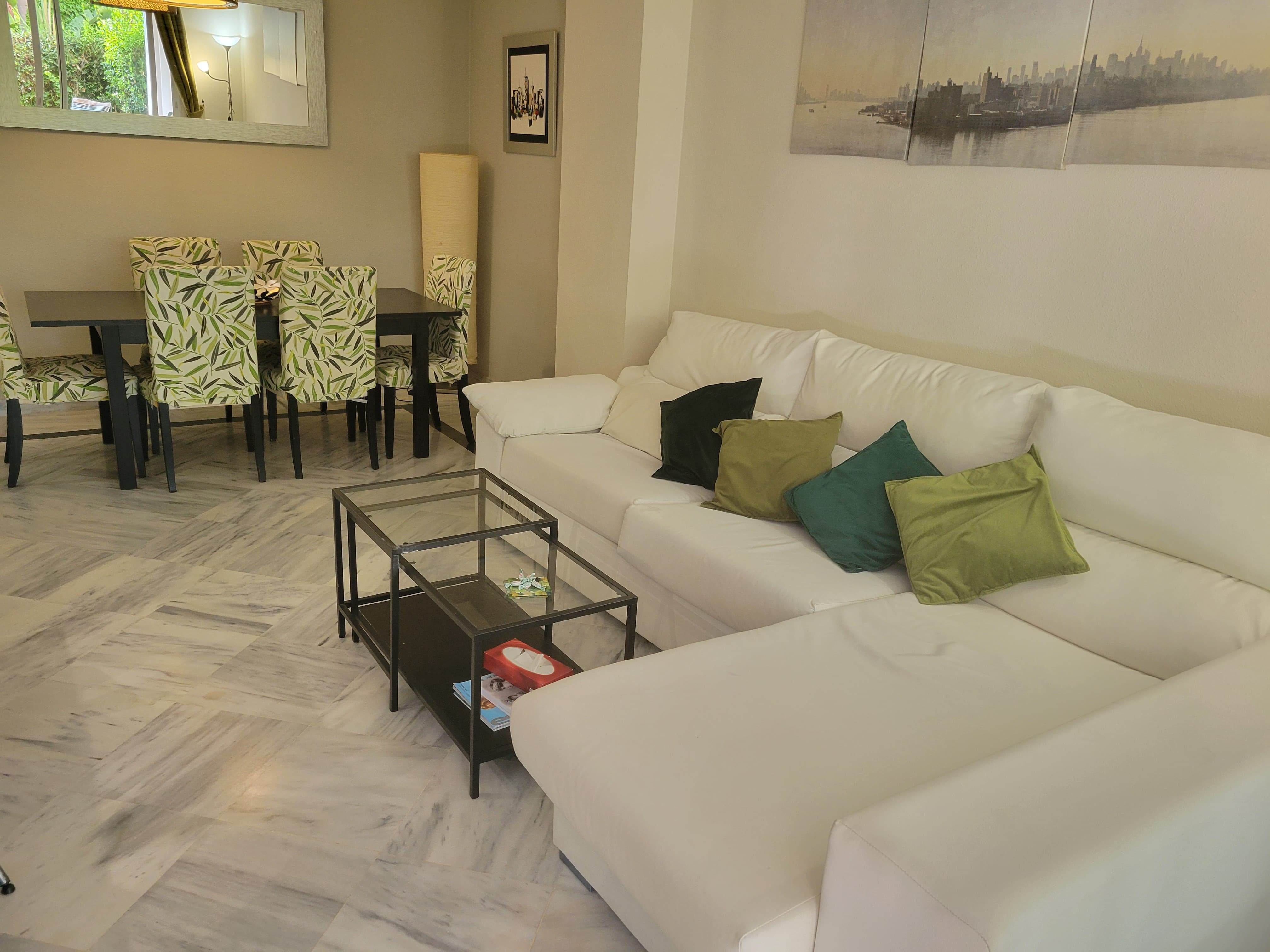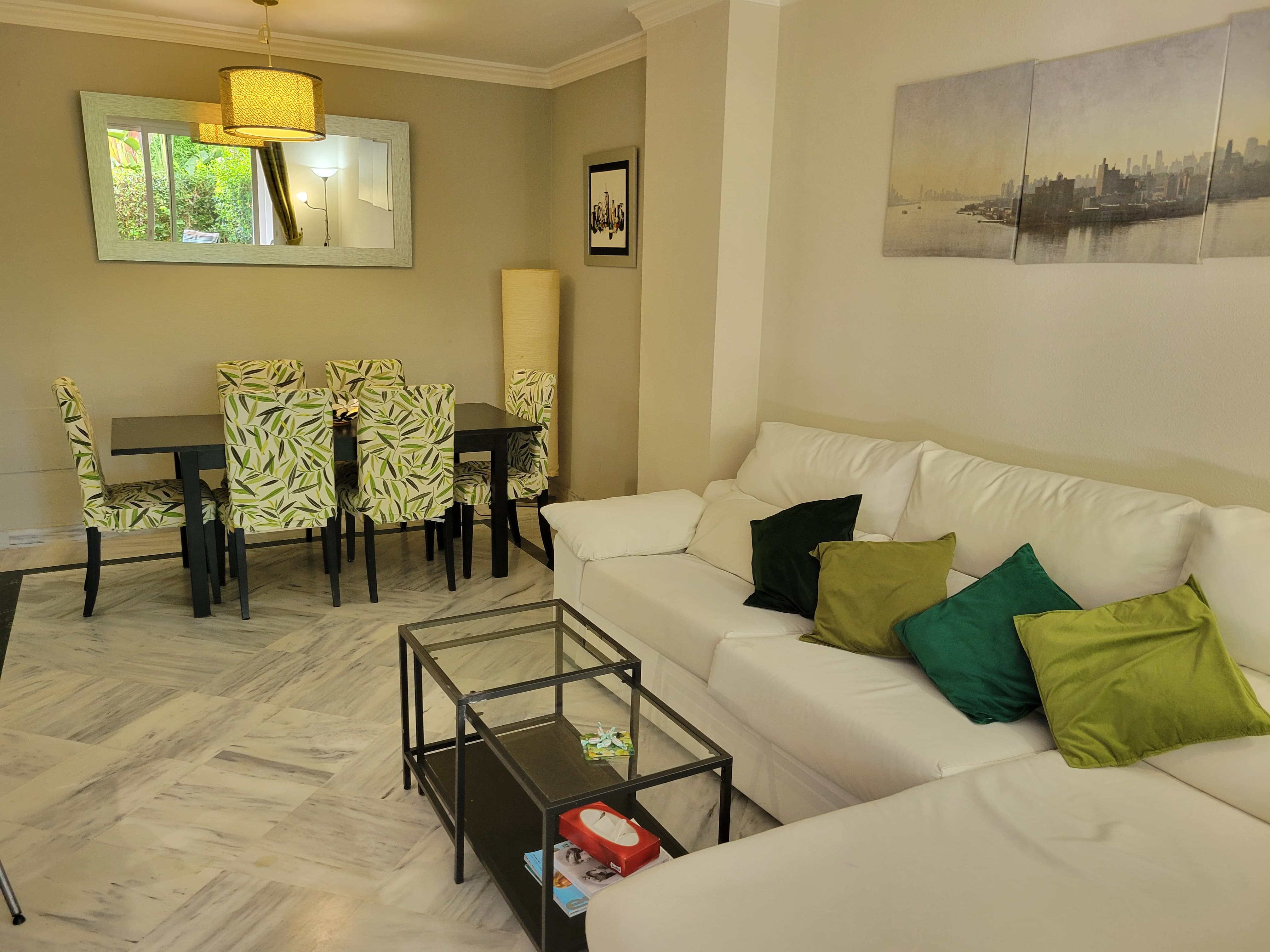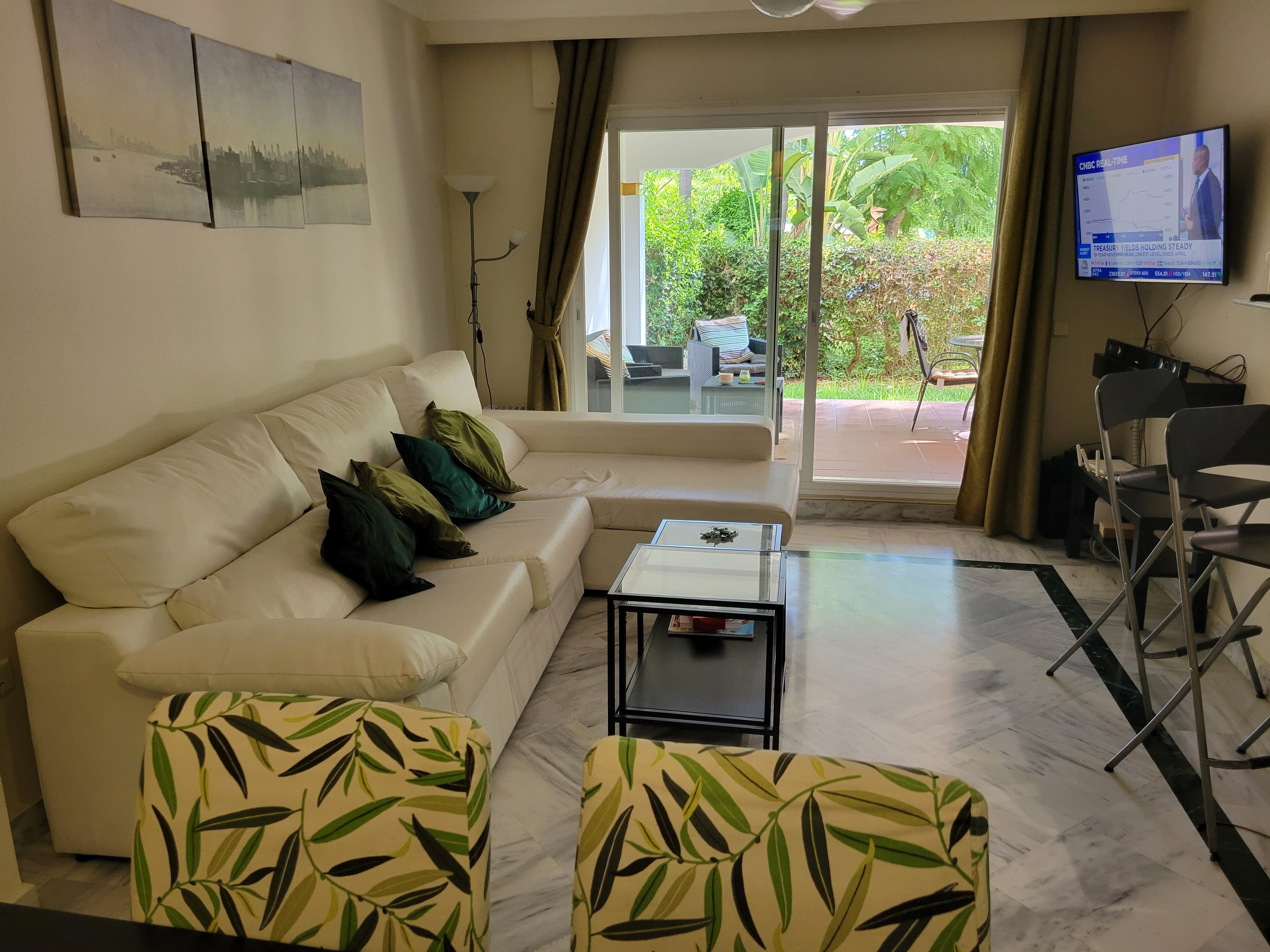 Two-bedroom newly furnished modern apartment situated close to Puerto Banus (10 - 15 min walk to Puerto Banus) in the ideally located Urb. La Dama de Noche. The property has its own a private garden, with maintained landscape and large orange tree with ample production during winter. The community has 6 Padel Tennis Courts (Free of charge), playground for kids, 2 large swimming pools (open during the summer) and a cosy restaurant serving lunch and dinners daily. It is ideally suited for couples and families wanting a relaxing holiday in the Sun, while having the world famous Puerto Banús conveniently close by. Great for golfers, La Dama de Noche is located next to a short 18 hole course called Banús Golf, and is only a short drive from a number of other fantastic golf courses.