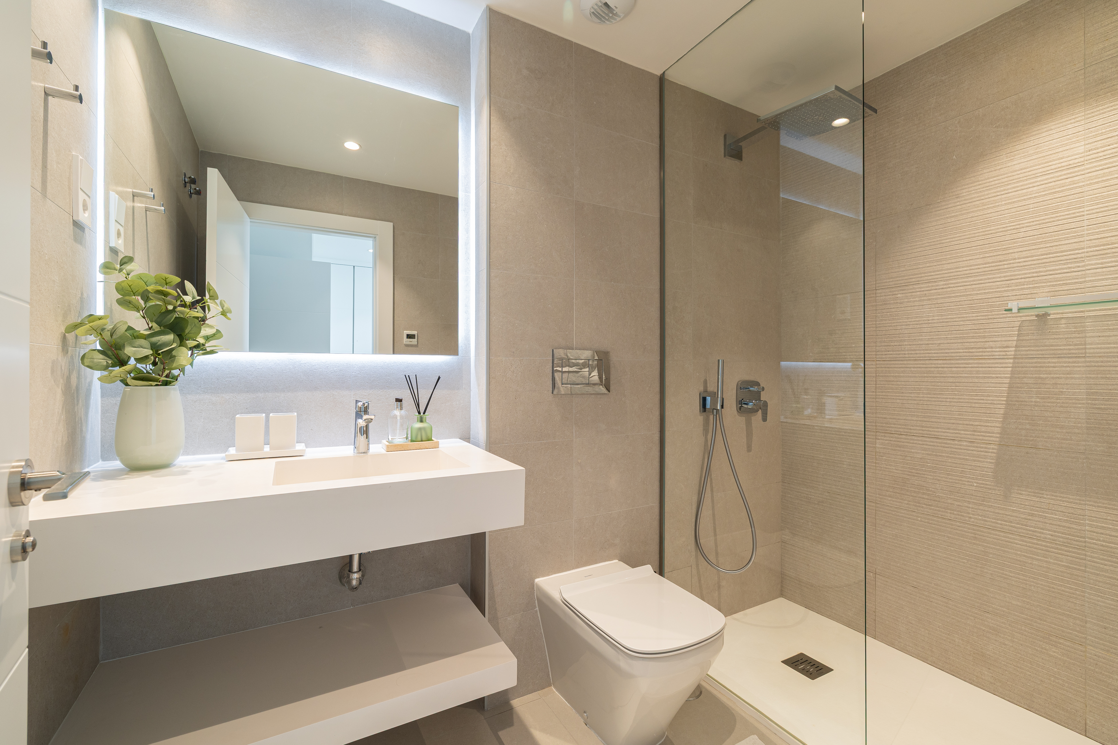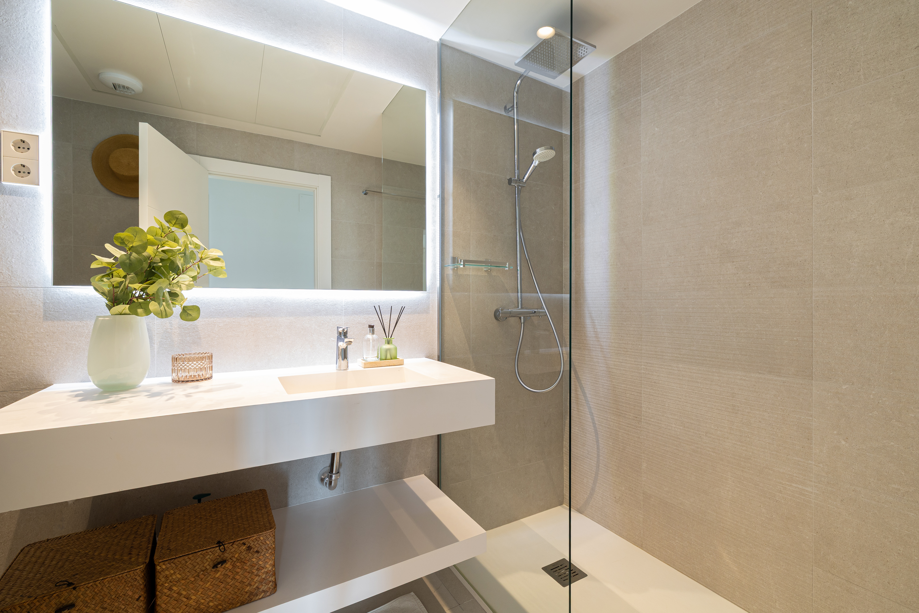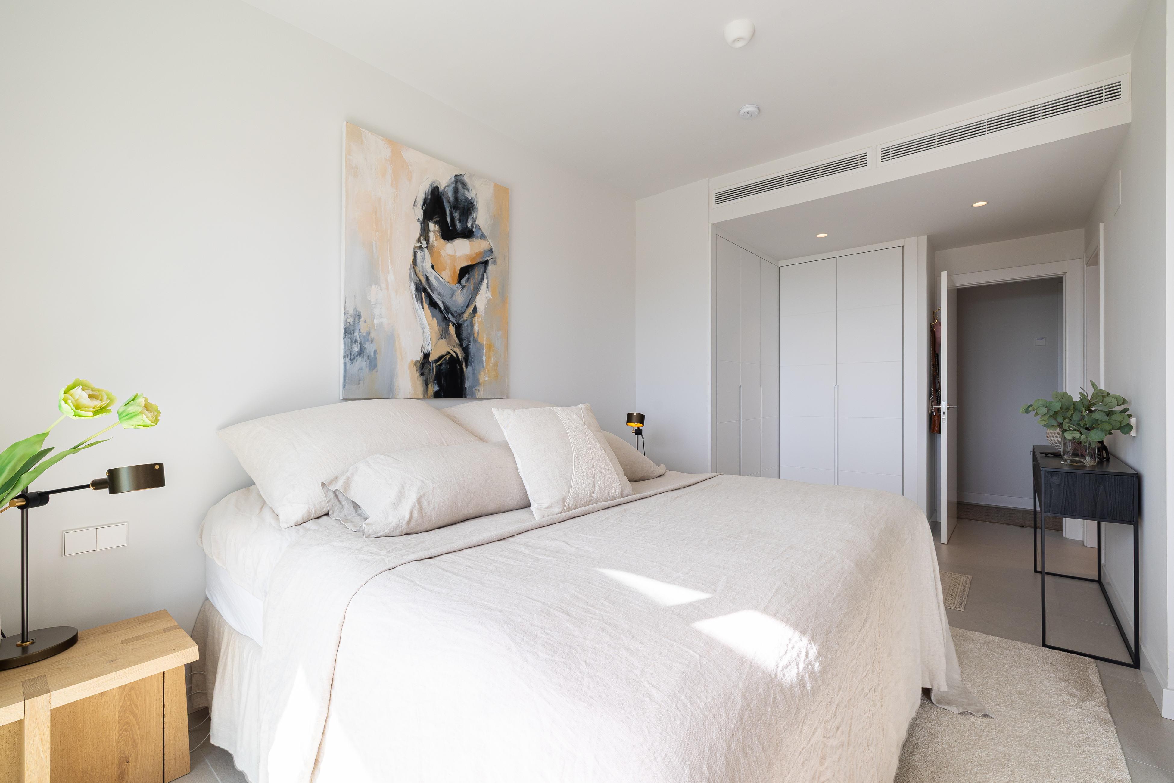 The apartment offers two well-appointed bedrooms. The master bedroom features a comfortable 180cm bed and a modern en-suite bathroom with a walk-in shower. The second bedroom includes two 90cm beds, making it ideal for family or guests. An additional bathroom, also fitted with a walk-in shower, ensures comfort and privacy for all.