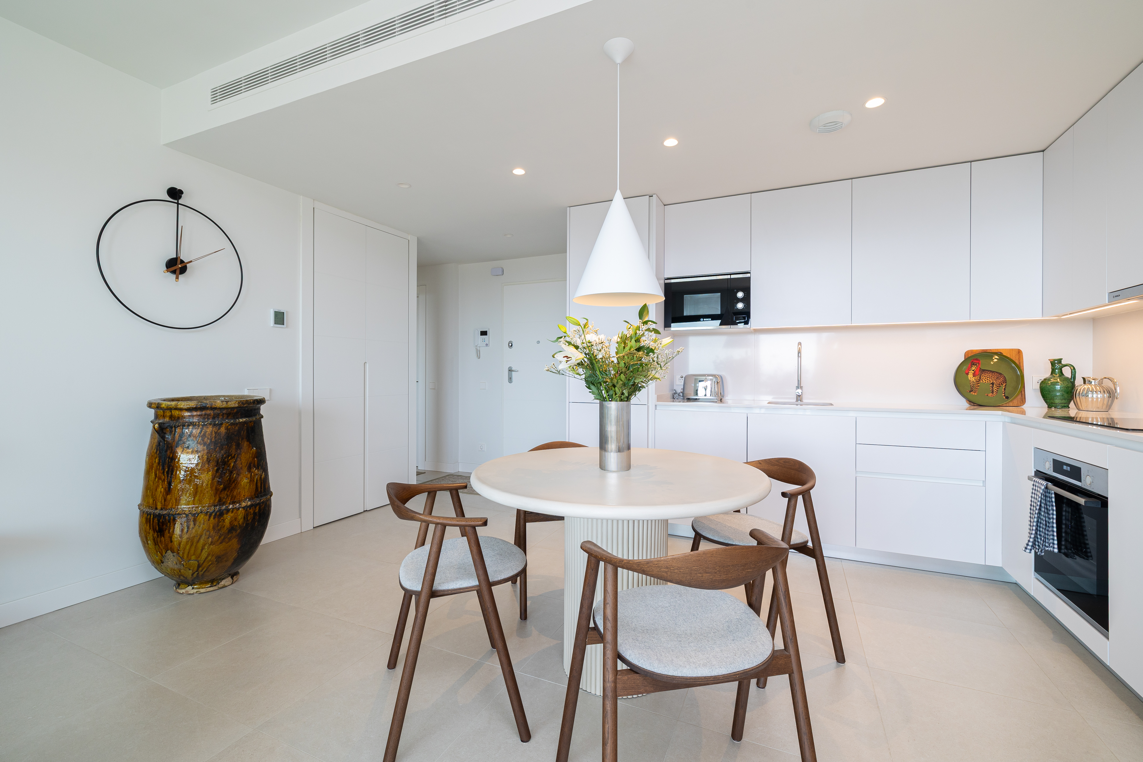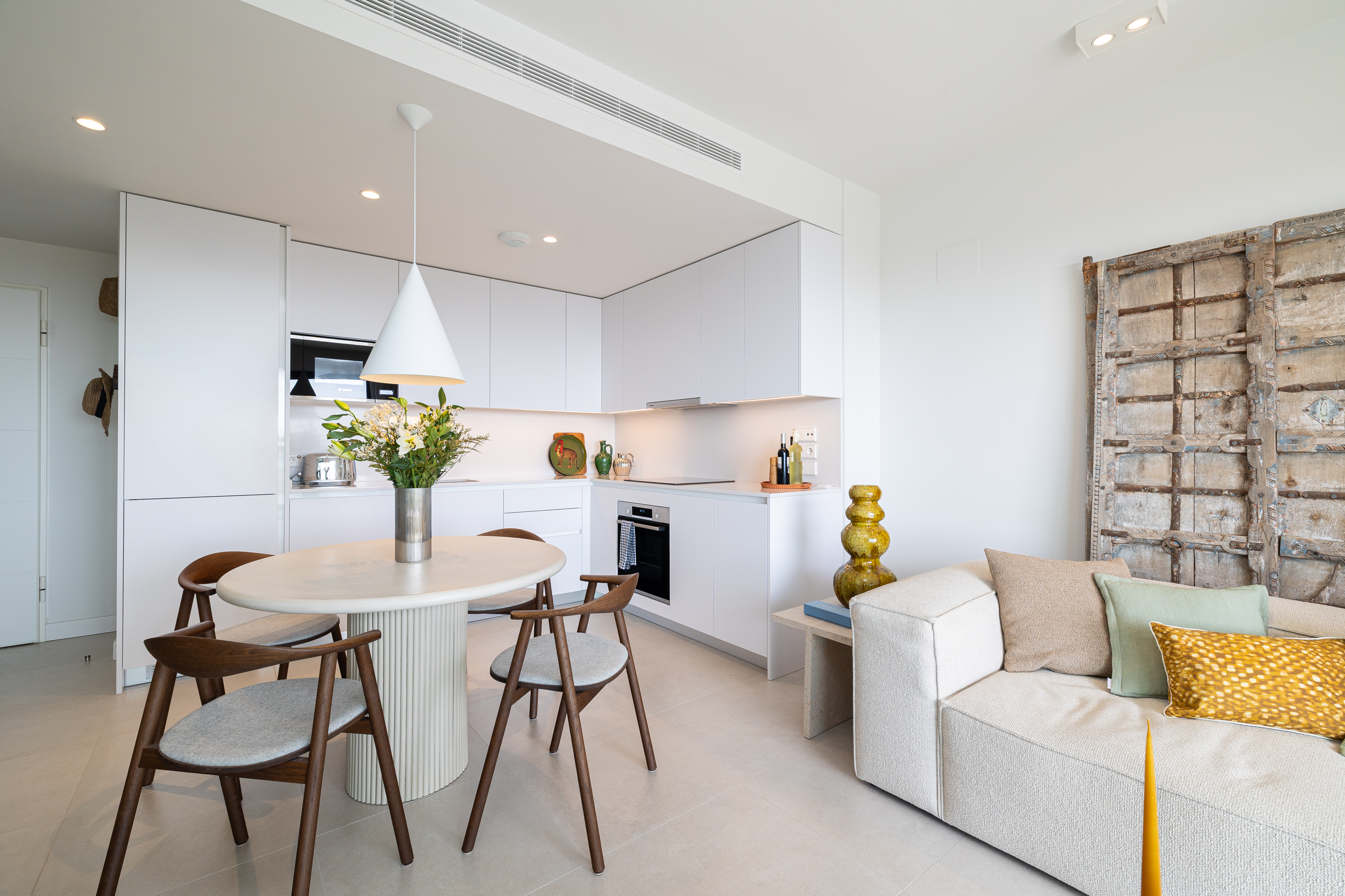 As you enter, you are welcomed into a stylish open-plan living area, thoughtfully decorated with soft neutral tones and natural textures. The fully equipped kitchen flows seamlessly into the dining and lounge space, creating a bright and sociable environment. Large sliding doors open onto a spacious private terrace, ideal for al fresco dining or relaxing in the sun. The property also features an impressive rooftop solarium with a BBQ area, a perfect setting for entertaining, sunbathing, and enjoying panoramic views.