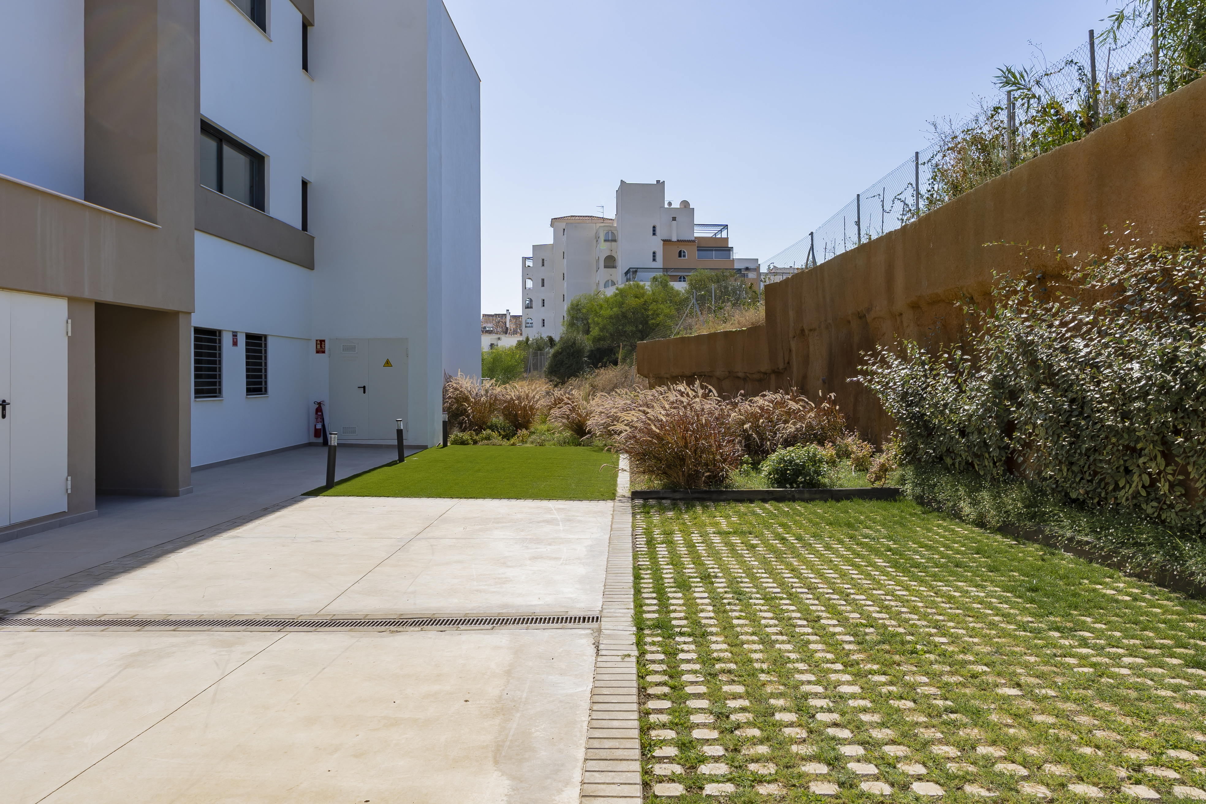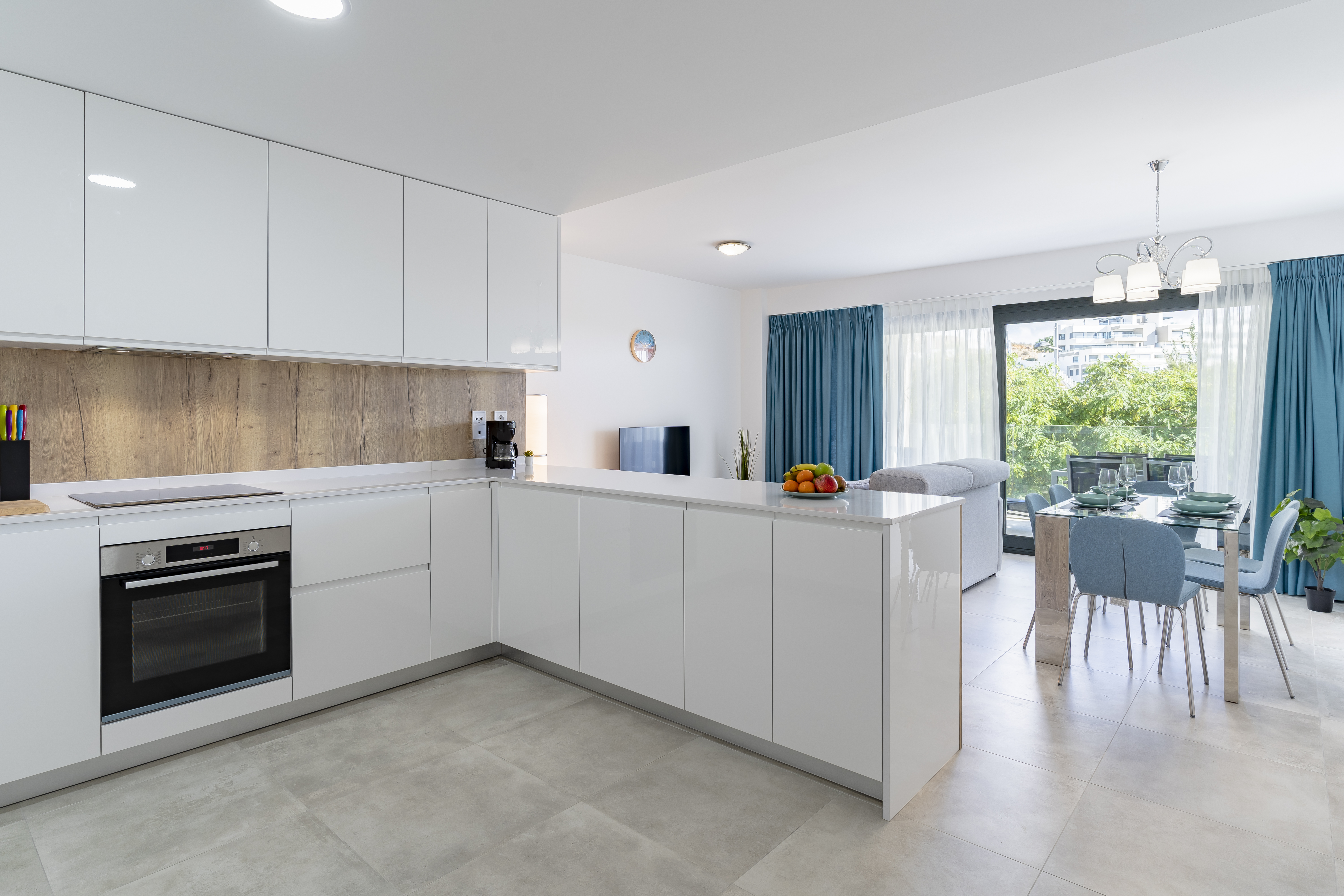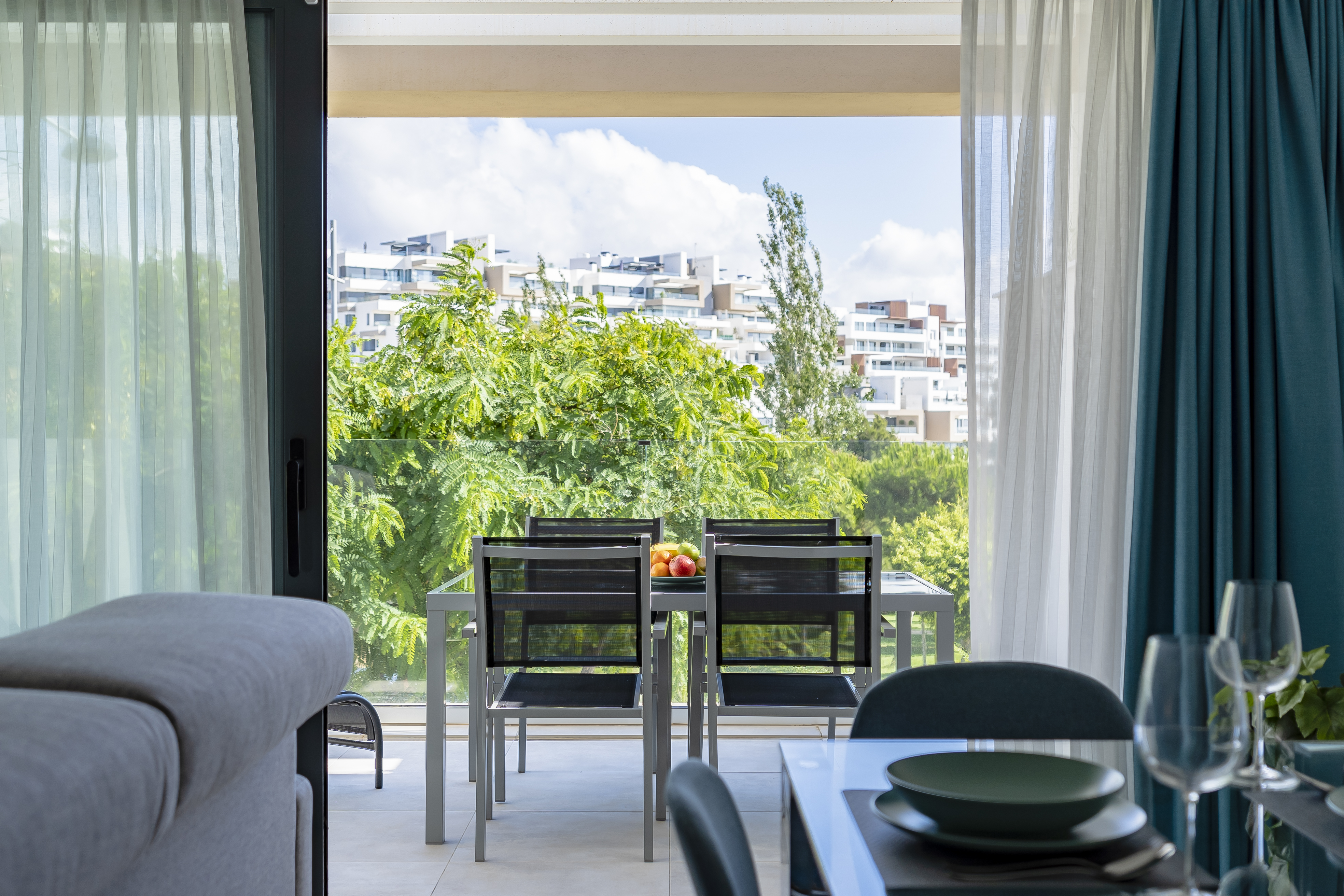 This east facing apartment features a spacious open-plan living and dining area with a fully equipped kitchen, which opens directly onto a lovely terrace, creating a bright and airy space with views over the park and partial sea views.