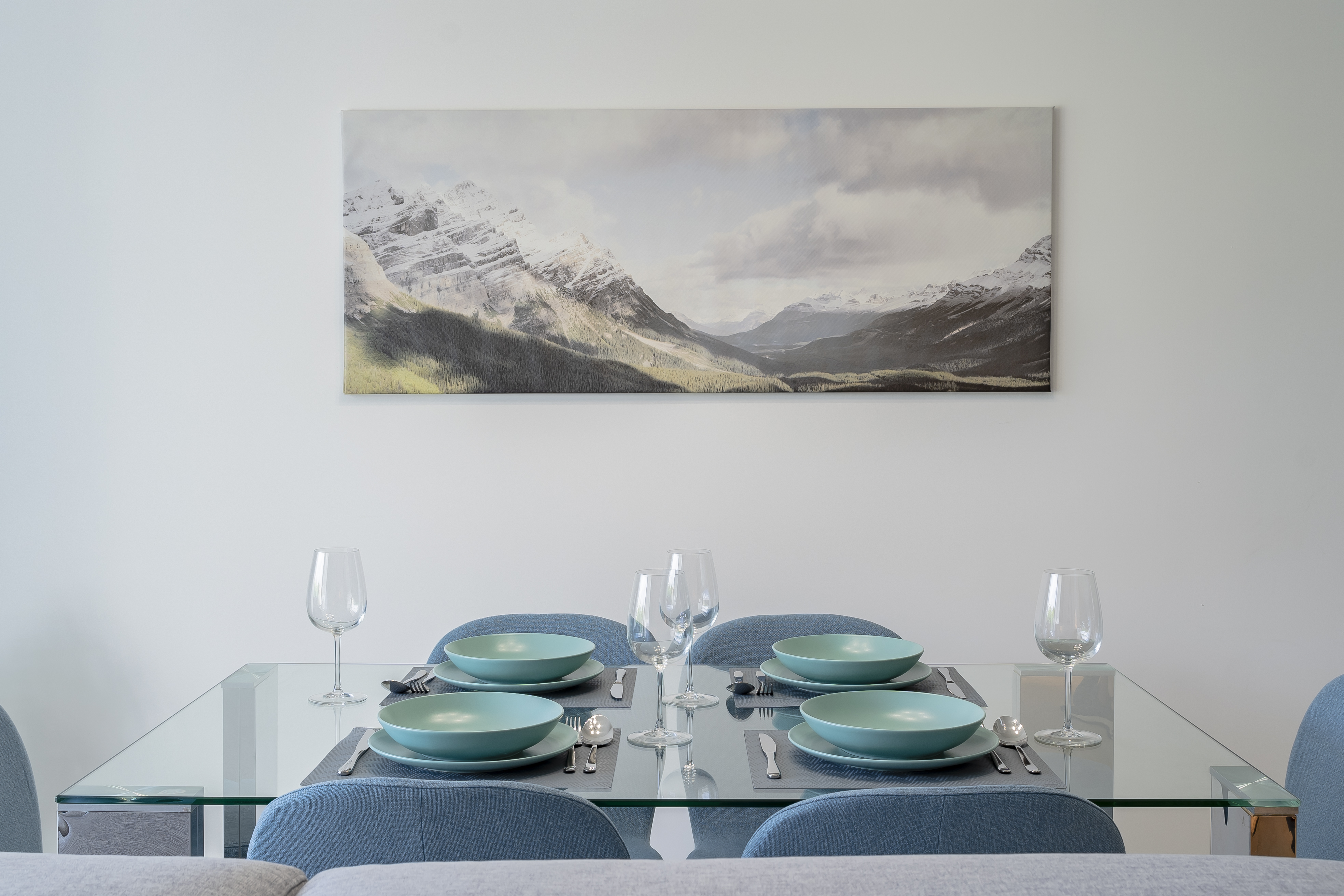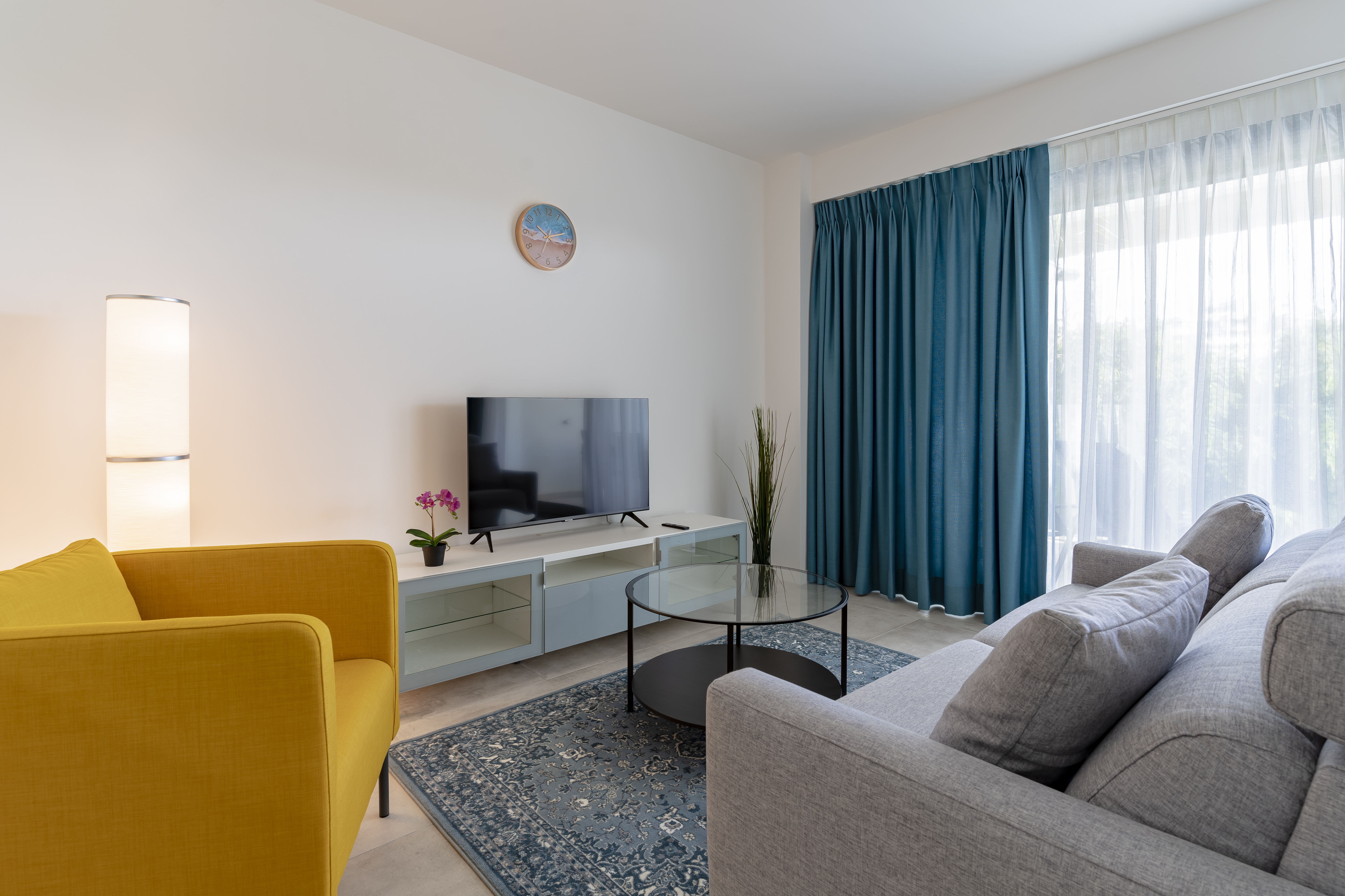 The master bedroom offers a comfortable 180 cm double bed and an en-suite bathroom, while the second bedroom is fitted with two 90 cm single beds. Both bedrooms are bright and provide ample storage space. A sofa bed in the living room provides additional sleeping space, making the apartment suitable for up to six guests.