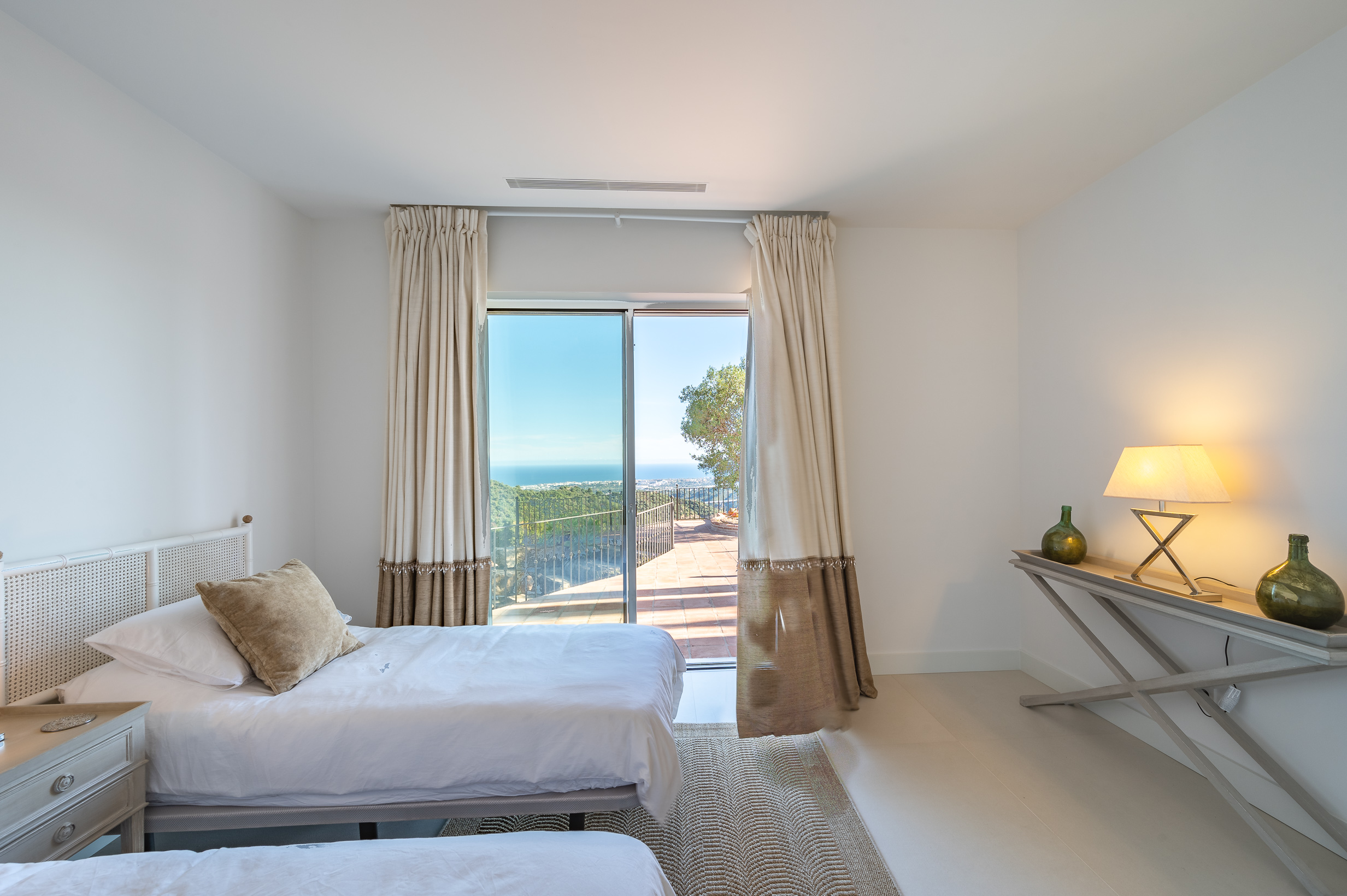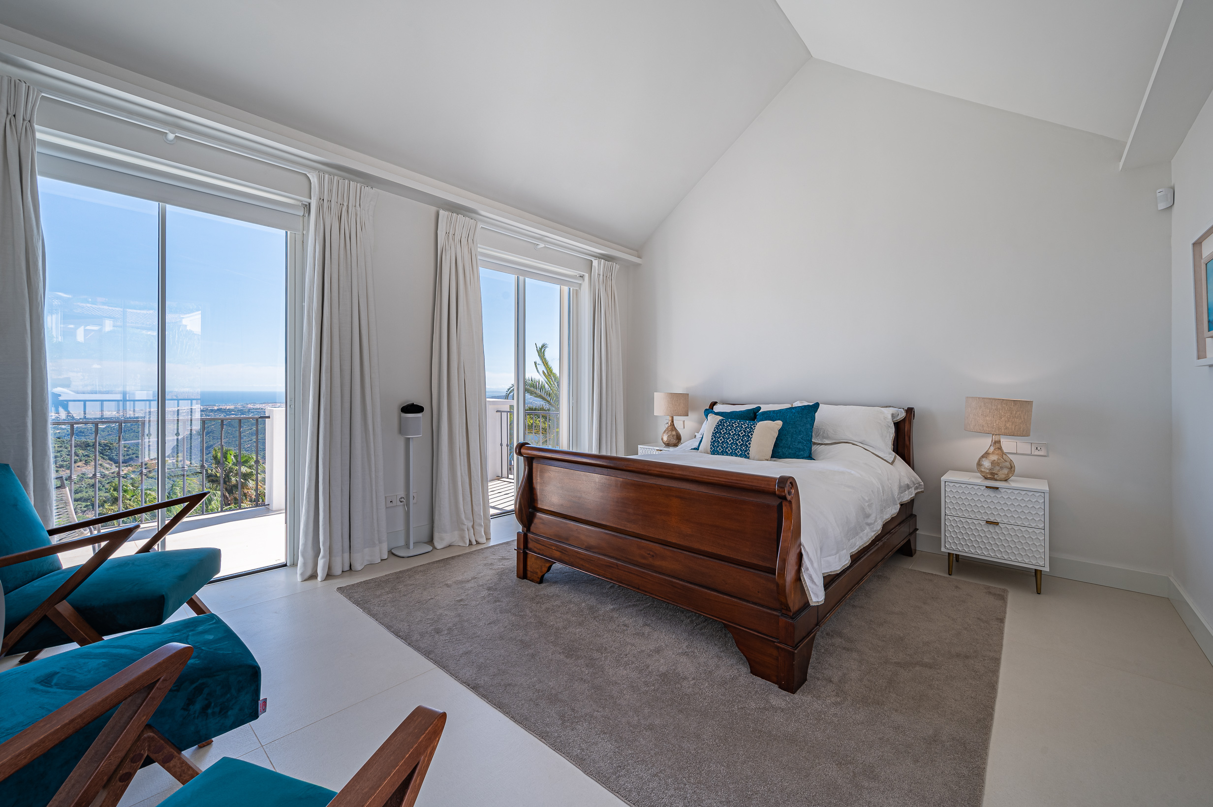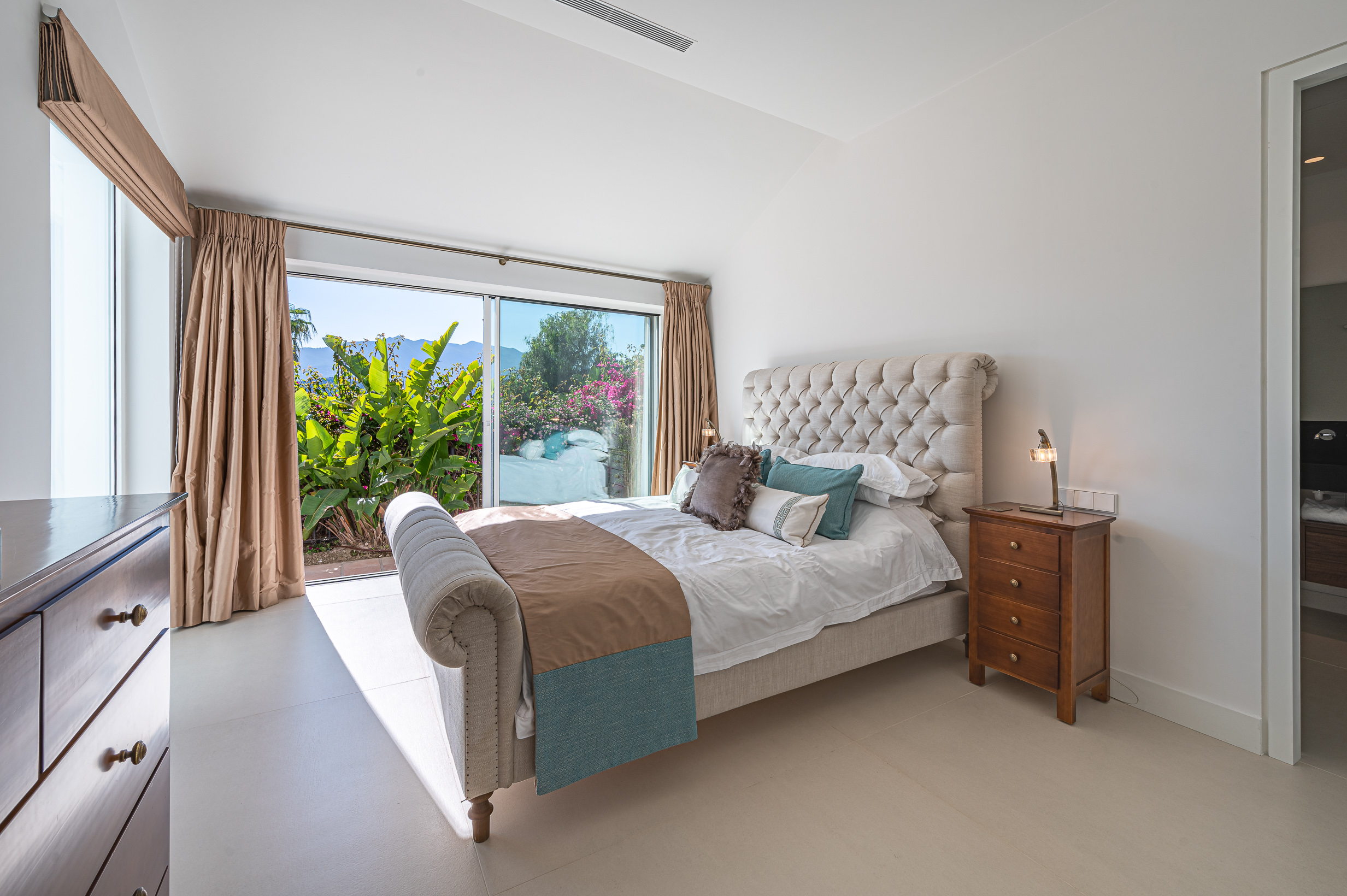 In total, the villa offers four beautifully appointed en-suite bedrooms, all flooded with natural light and enjoying breathtaking panoramic sea views. Floor-to-ceiling windows create a bright and airy atmosphere throughout the sleeping areas, while high-quality Egyptian cotton linens and plush pillows ensure exceptional comfort and truly restful nights.