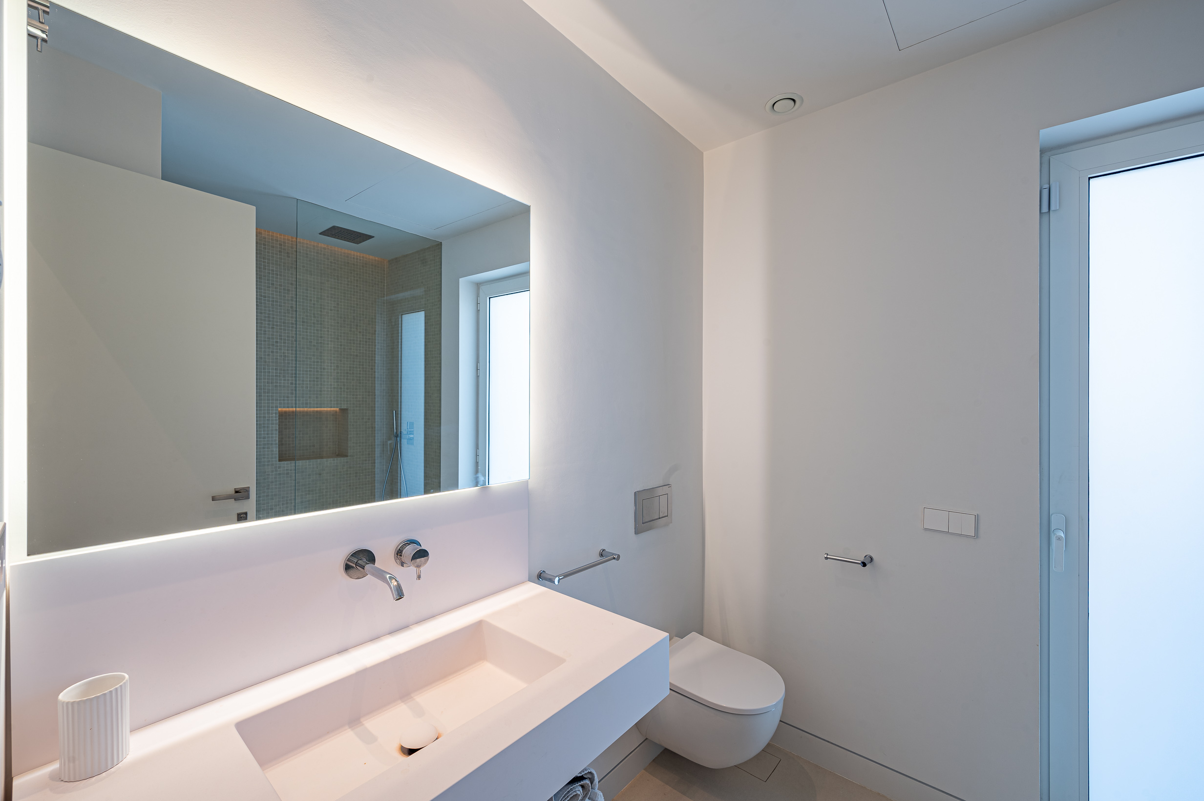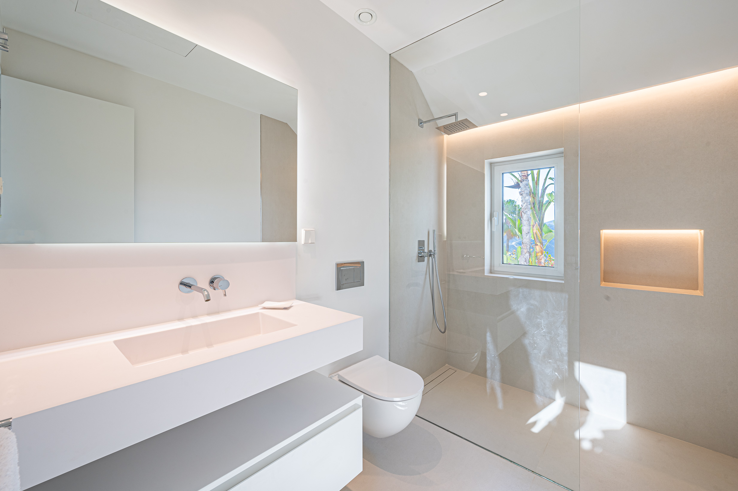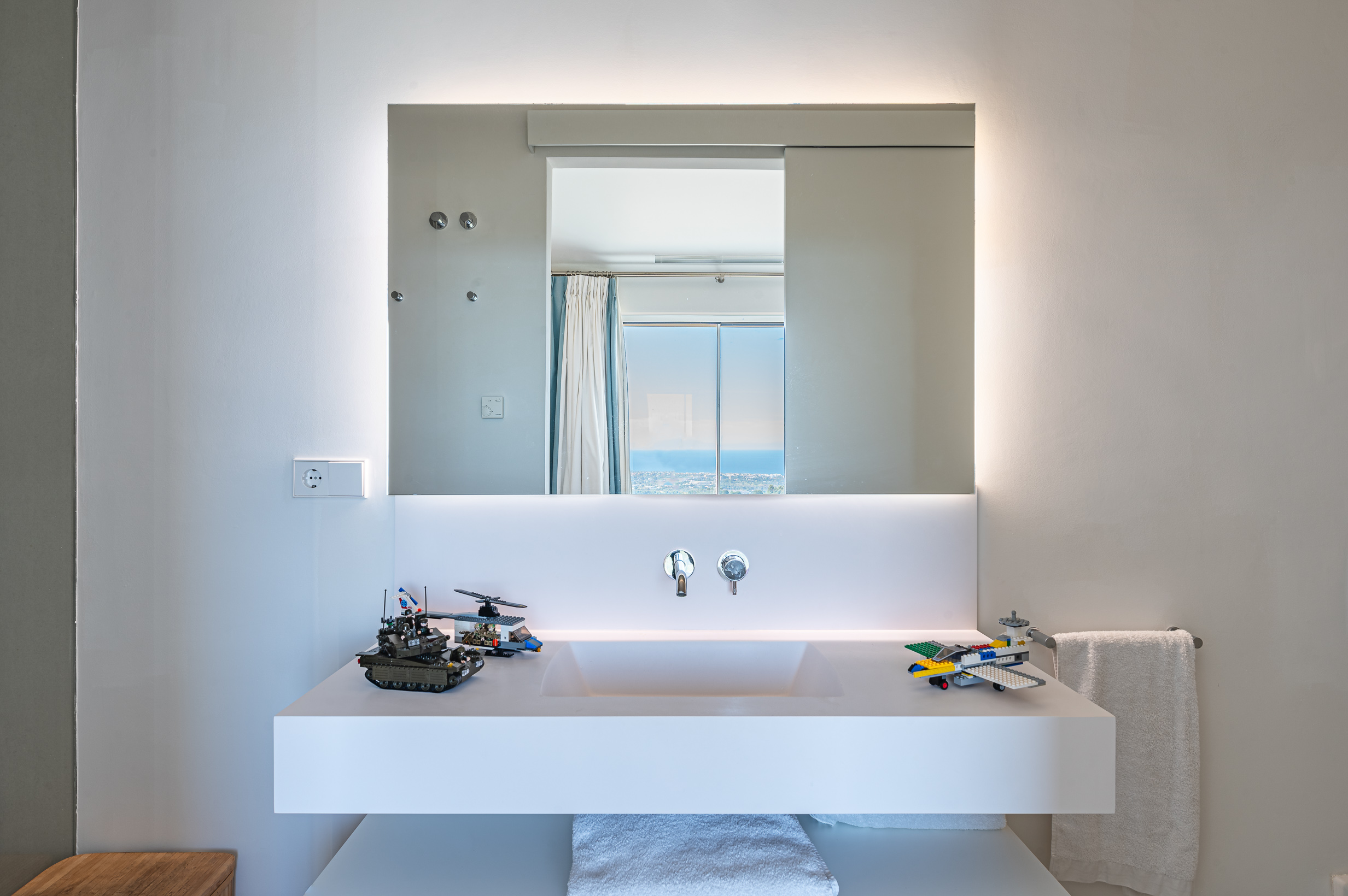 In total, the villa offers four beautifully appointed en-suite bedrooms, all flooded with natural light and enjoying breathtaking panoramic sea views. Floor-to-ceiling windows create a bright and airy atmosphere throughout the sleeping areas, while high-quality Egyptian cotton linens and plush pillows ensure exceptional comfort and truly restful nights.