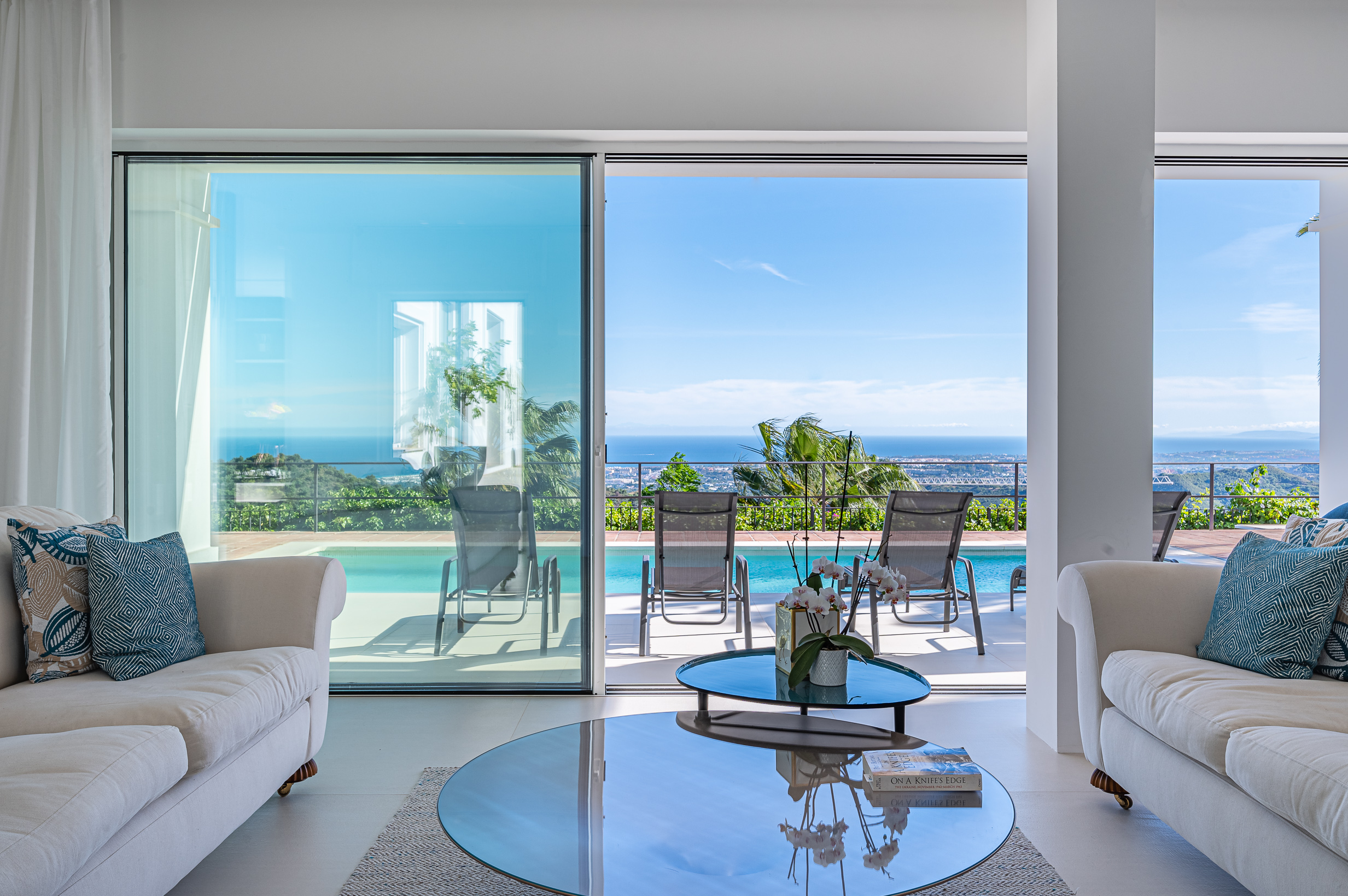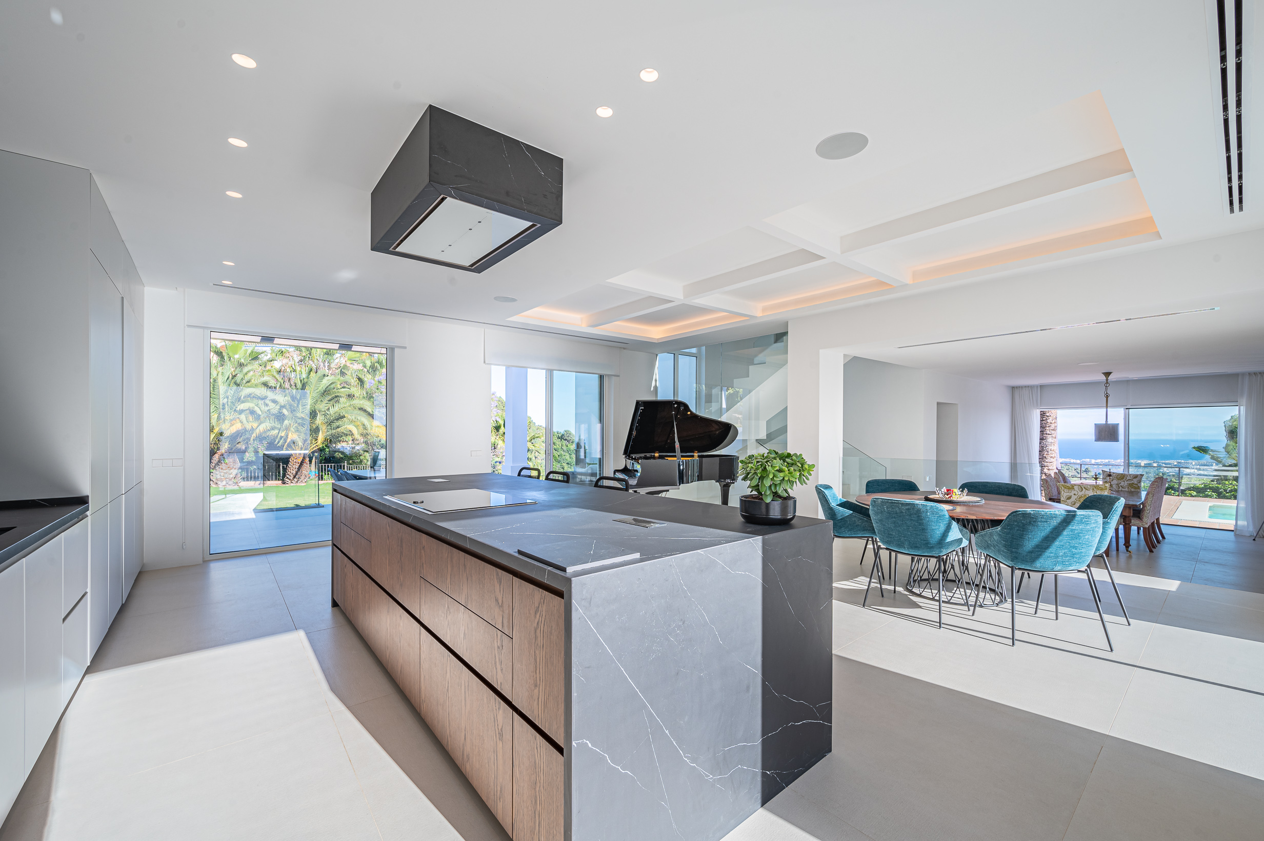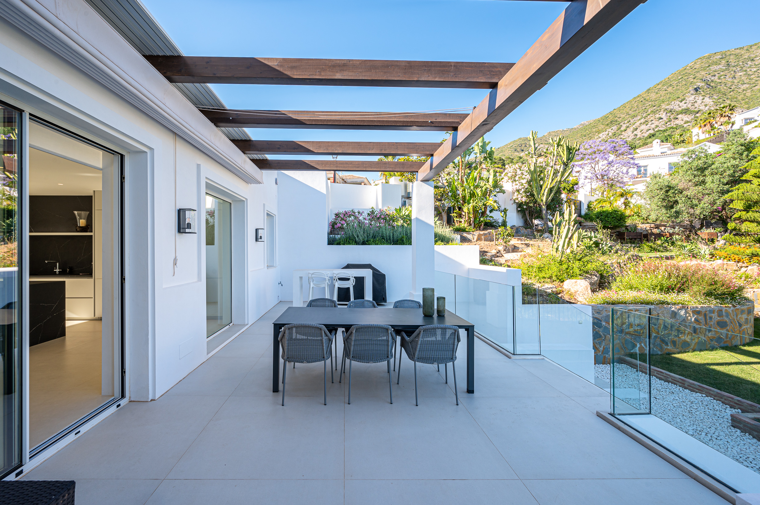 Outside, landscaped gardens and multiple relaxation areas frame panoramic mountain and sea views, creating inviting spaces to unwind throughout the day. Guests can enjoy the large swimming pool and outdoor kitchen with BBQ area, while evenings are enhanced by the tranquillity of the surrounding nature.