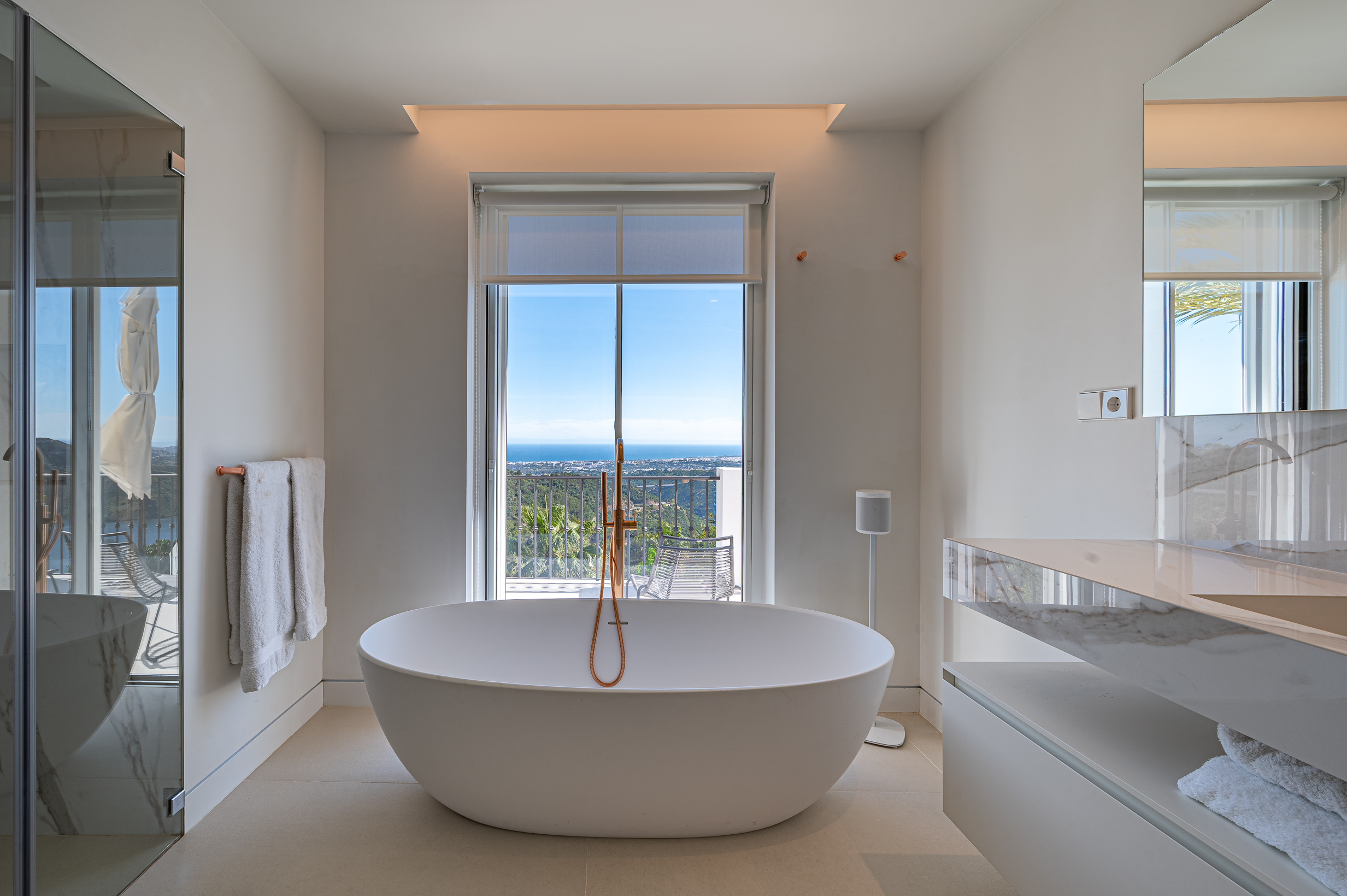 The upper floor is dedicated to rest and relaxation. The stunning master suite features a 200 cm bed and breathtaking panoramic coastline views, along with a freestanding bathtub, walk-in shower, separate dressing area, and direct access to a private terrace. An additional en-suite bedroom with a 180 cm bed is also located on this level, designed for comfort and privacy.