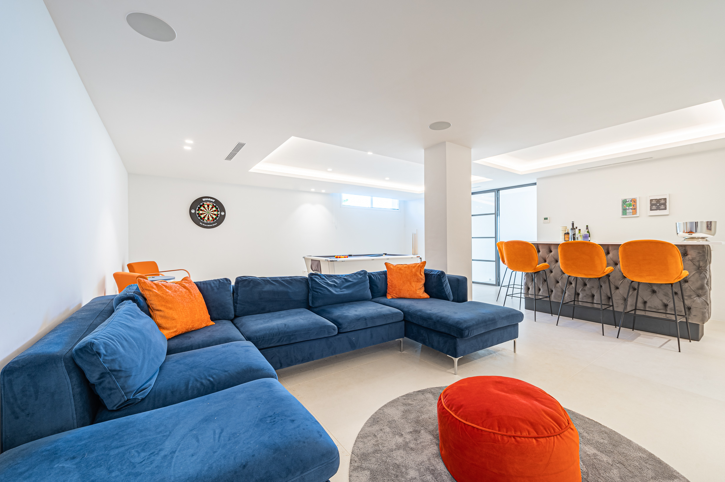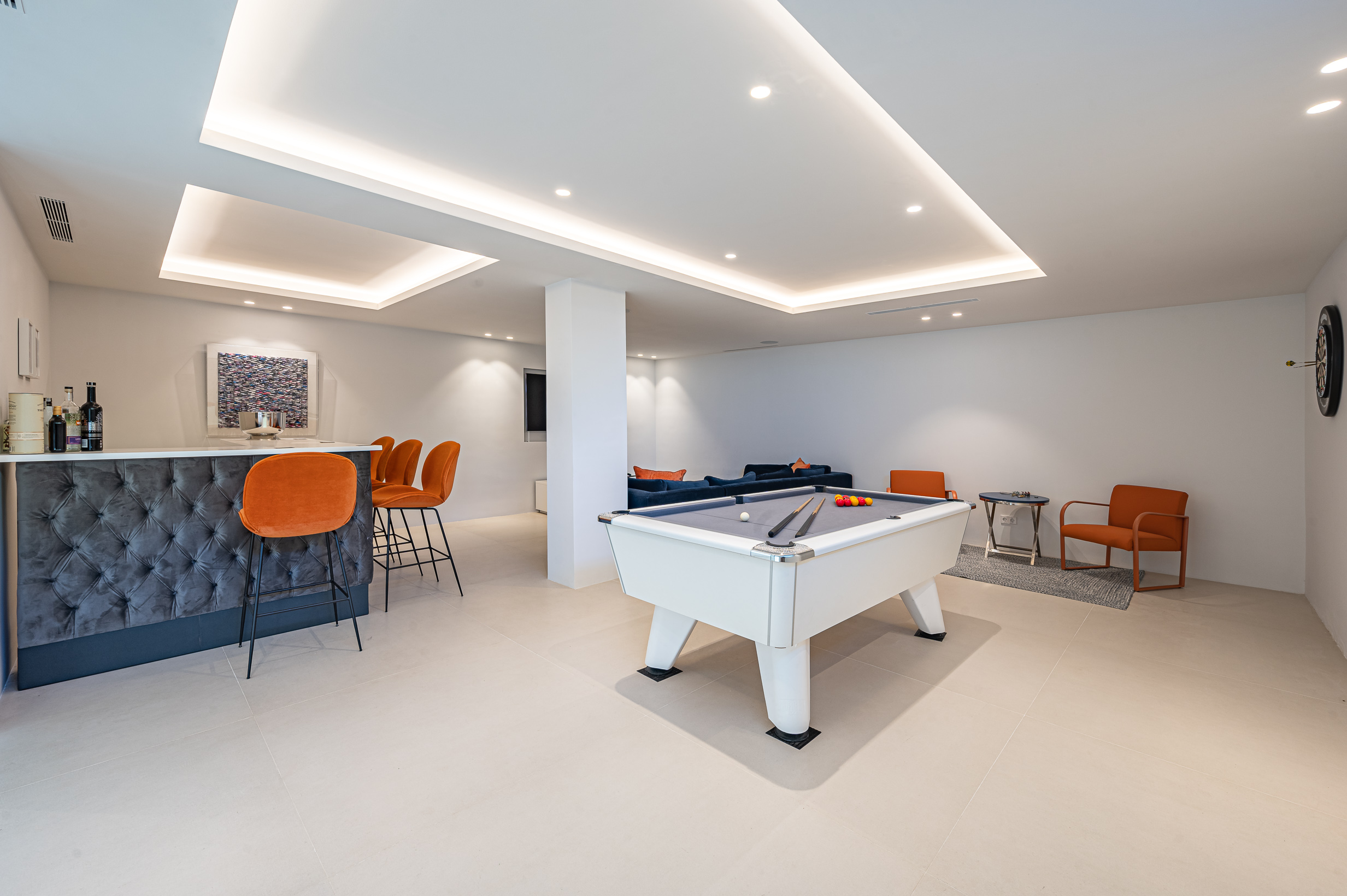 For leisure and entertainment, the villa includes a stylish games room with a bar, pool table, darts board, surround-sound TV, a Sonos sound system, and an Xbox 360 with a selection of games suitable for all ages. A private gym is also available, equipped with free weights, resistance bands, TRX straps, a Life Fitness step machine, and a television for streaming workouts or entertainment during exercise.