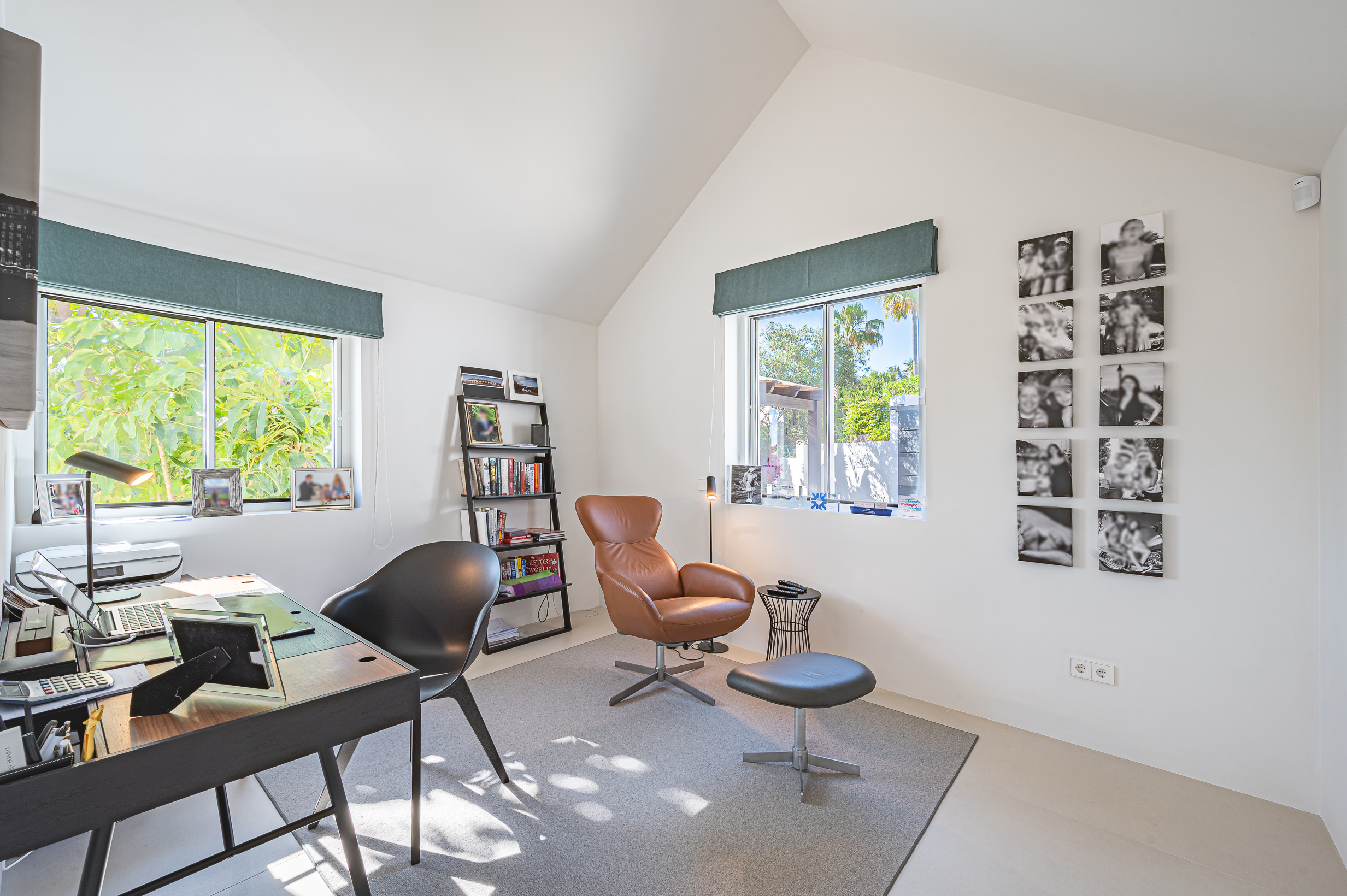 On the ground floor, there are two elegant en-suite bedrooms, one fitted with a 180 cm bed and the other with two 90 cm beds, each with its own private bathroom. This level also features a fully equipped office with an en-suite bathroom, making it ideal for remote working or offering additional private accommodation.