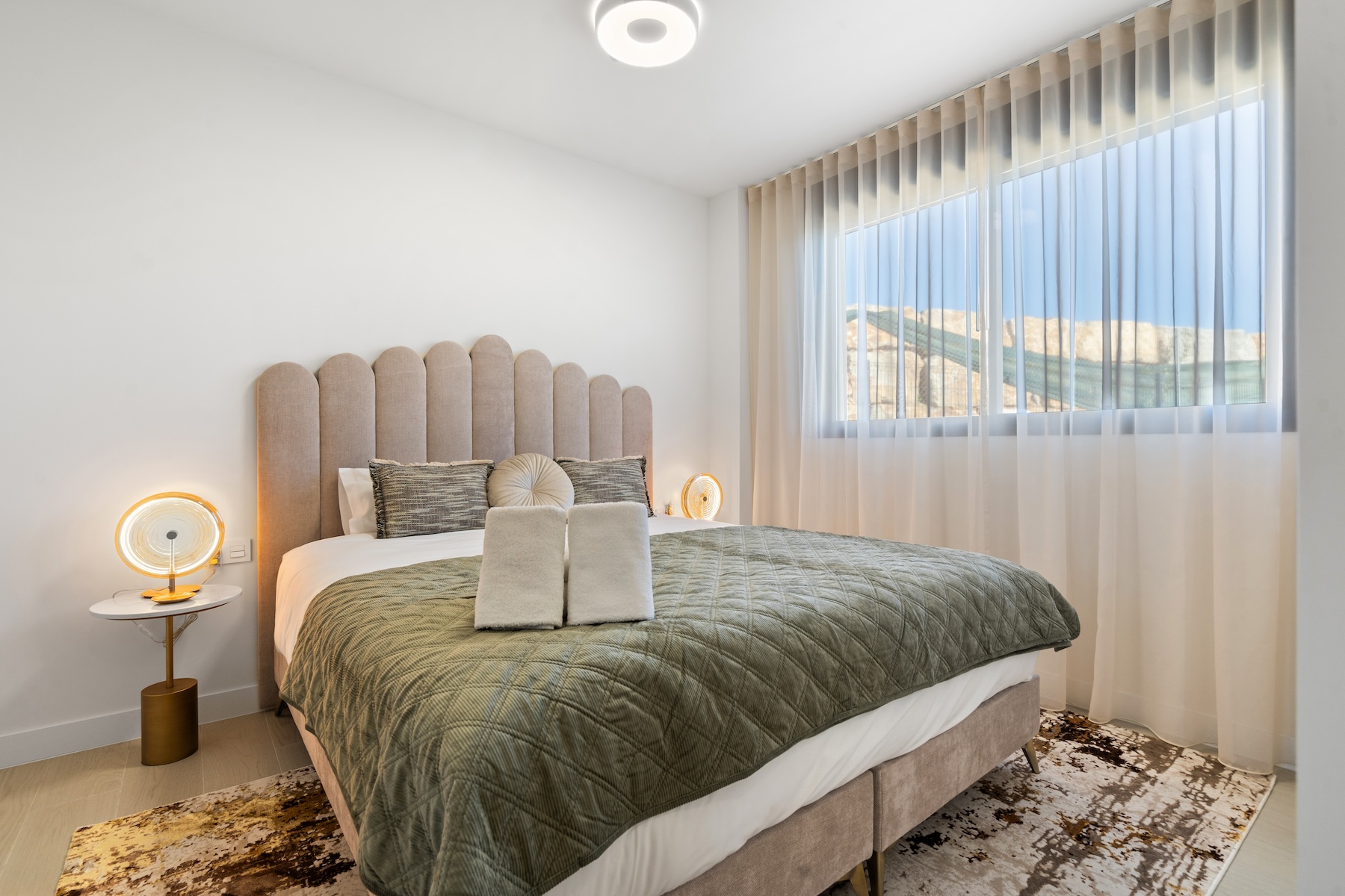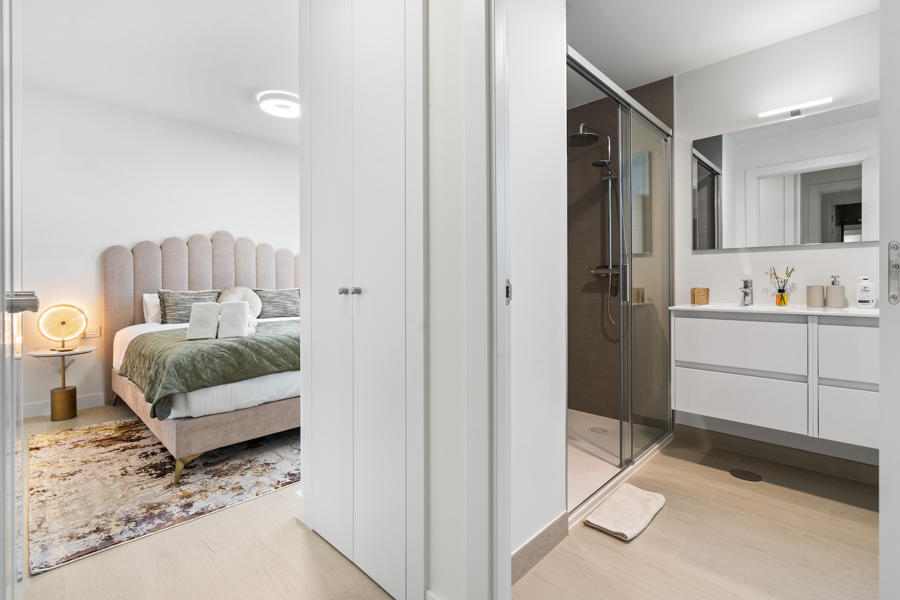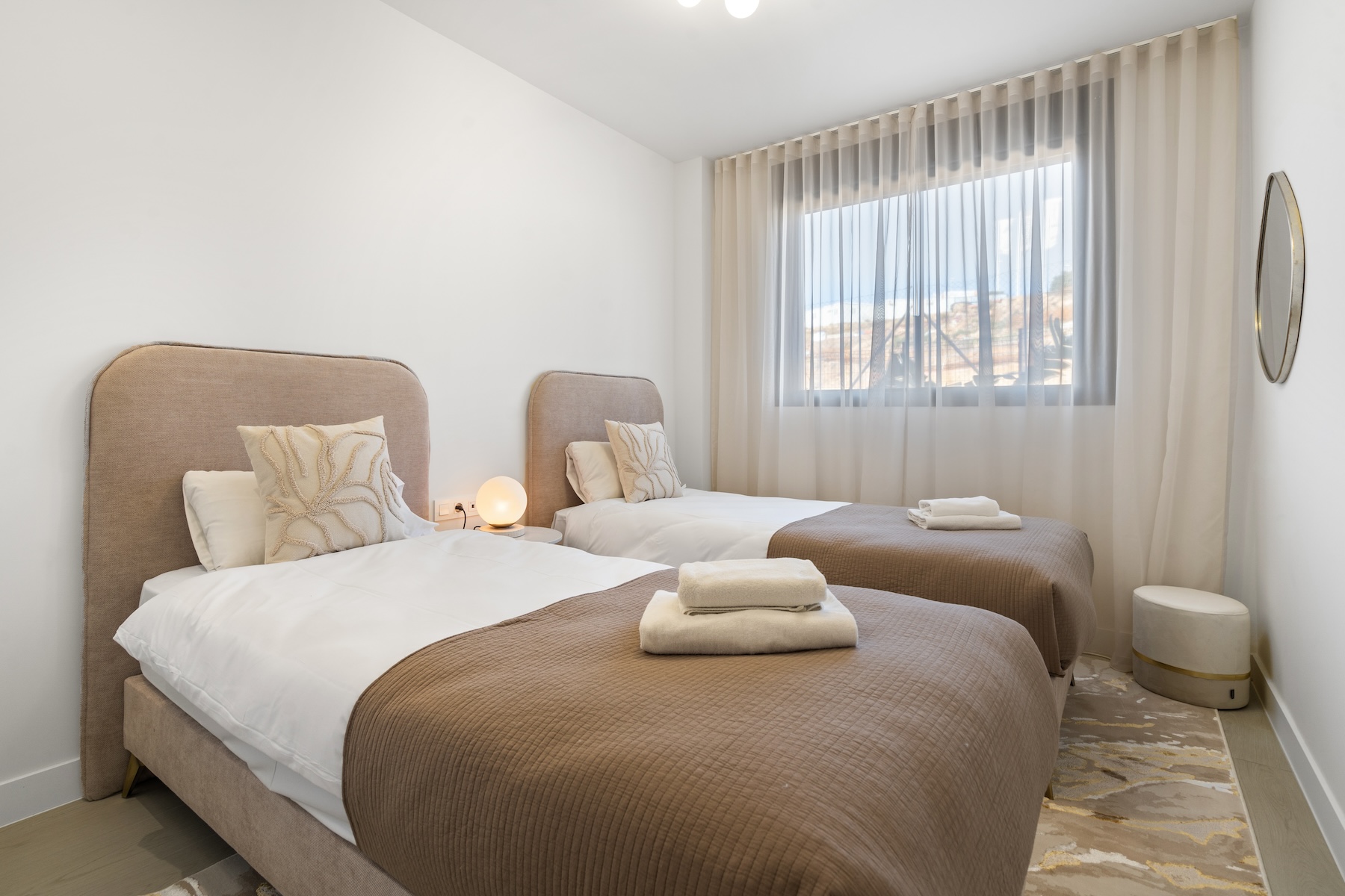 The apartment offers three comfortable bedrooms, all thoughtfully designed to provide a calm and relaxing atmosphere. The master bedroom features a 180x200cm bed and benefits from an en-suite bathroom. The remaining two bedrooms are each furnished with two 90x200 cm beds, which can be arranged together or kept separate, offering maximum flexibility to suit guests, children, or use as a home office. A second modern bathroom serves these bedrooms, ensuring comfort, convenience, and functionality for all occupants.