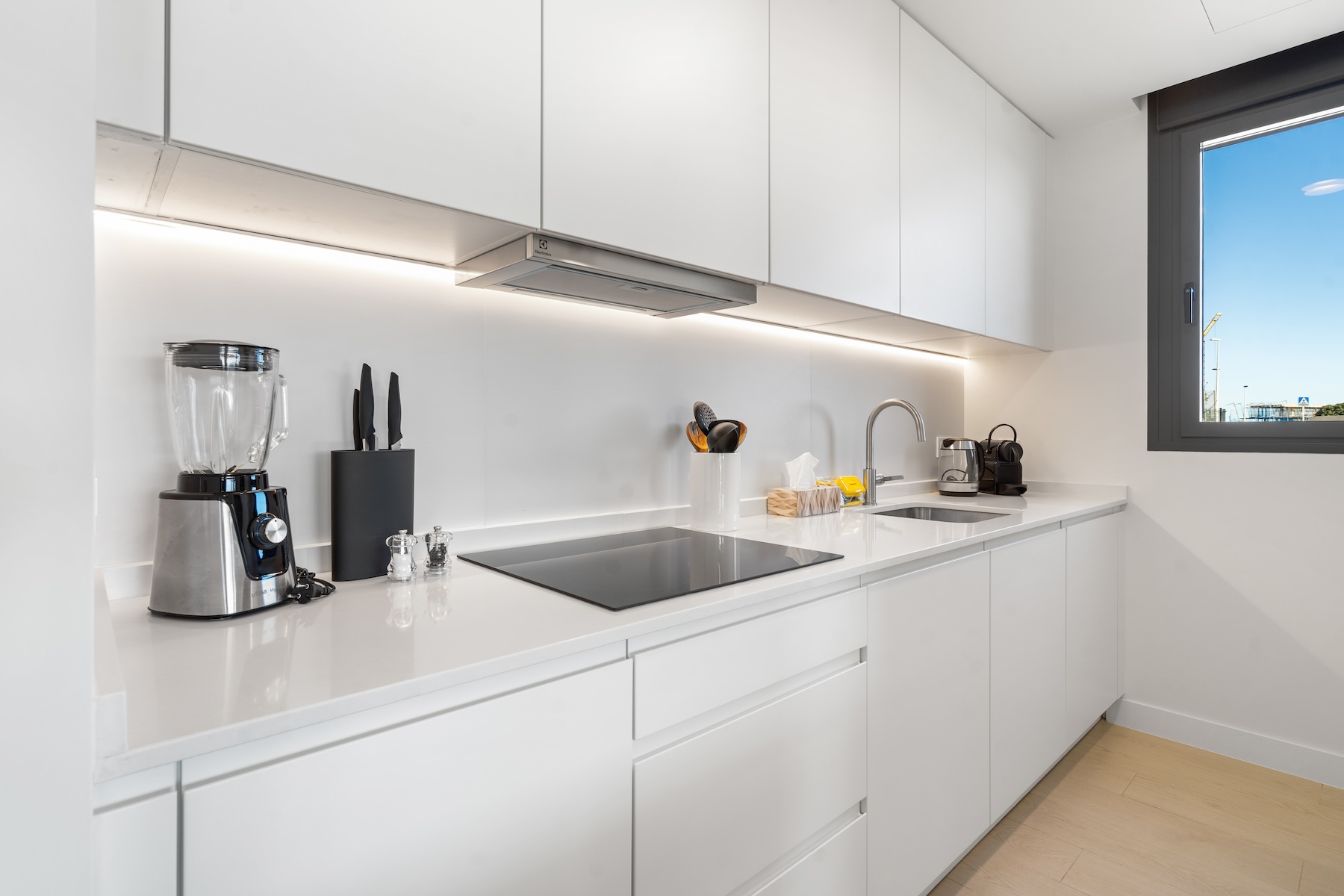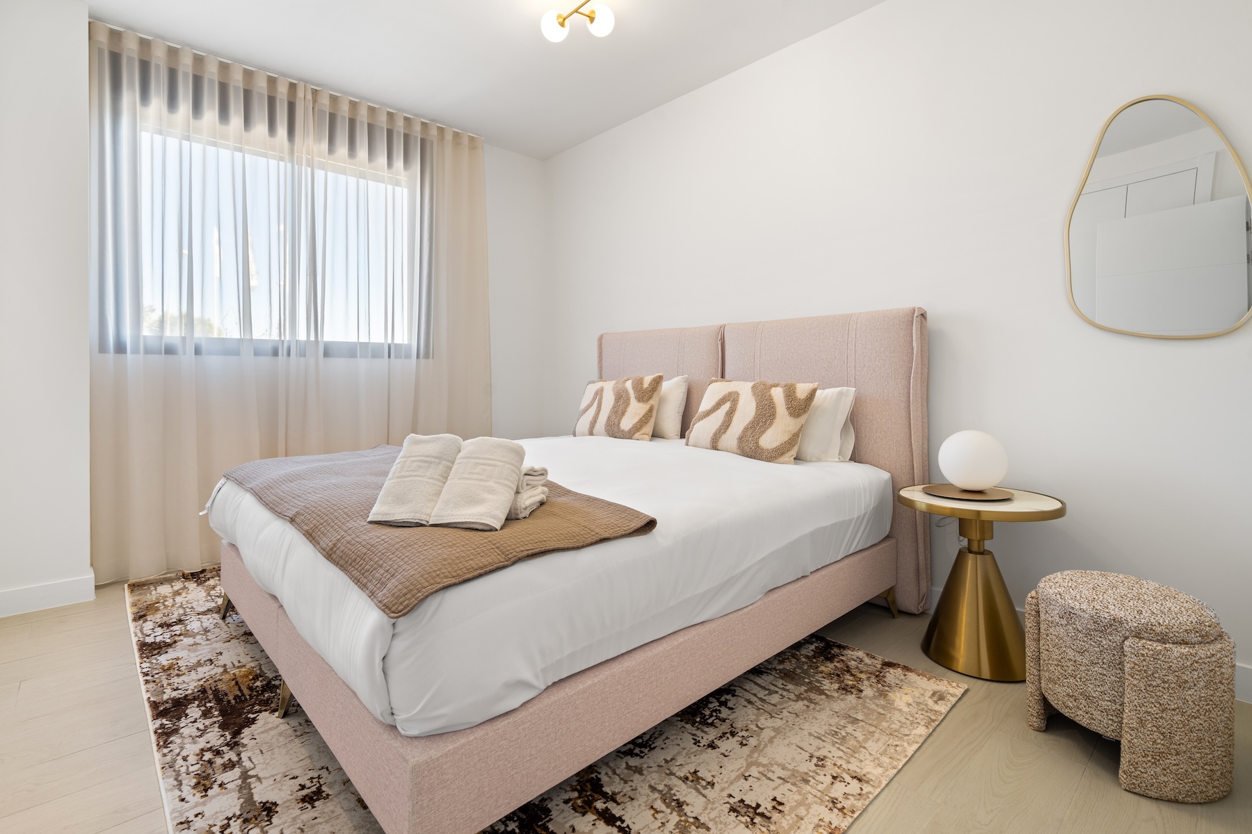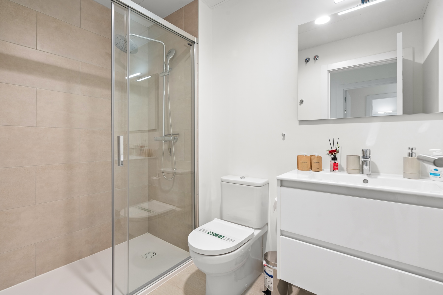 The apartment offers three comfortable bedrooms, all thoughtfully designed to provide a calm and relaxing atmosphere. The master bedroom features a 180x200cm bed and benefits from an en-suite bathroom. The remaining two bedrooms are each furnished with two 90x200 cm beds, which can be arranged together or kept separate, offering maximum flexibility to suit guests, children, or use as a home office. A second modern bathroom serves these bedrooms, ensuring comfort, convenience, and functionality for all occupants.