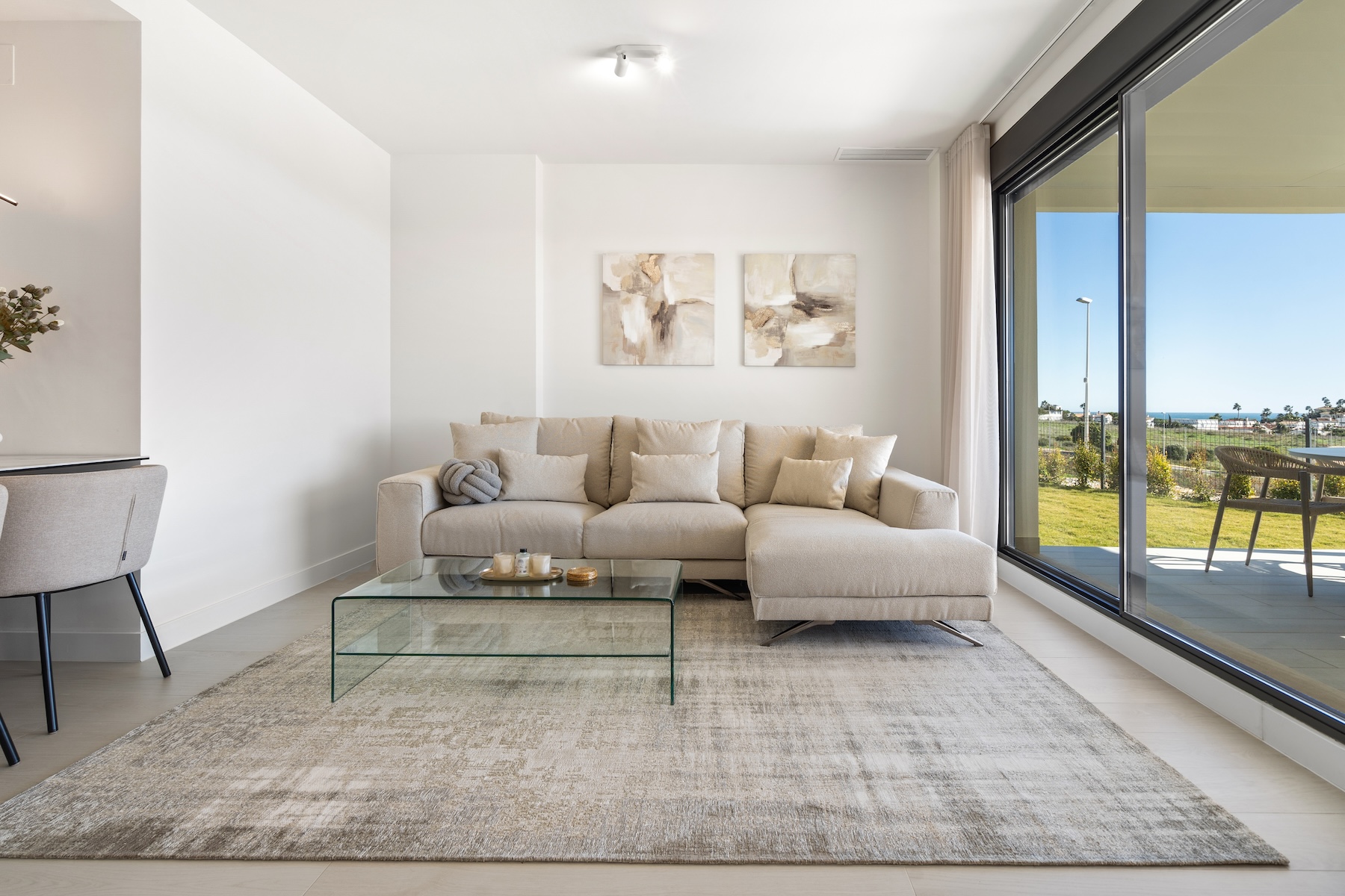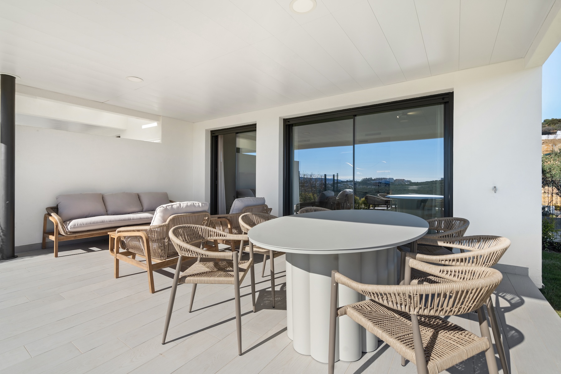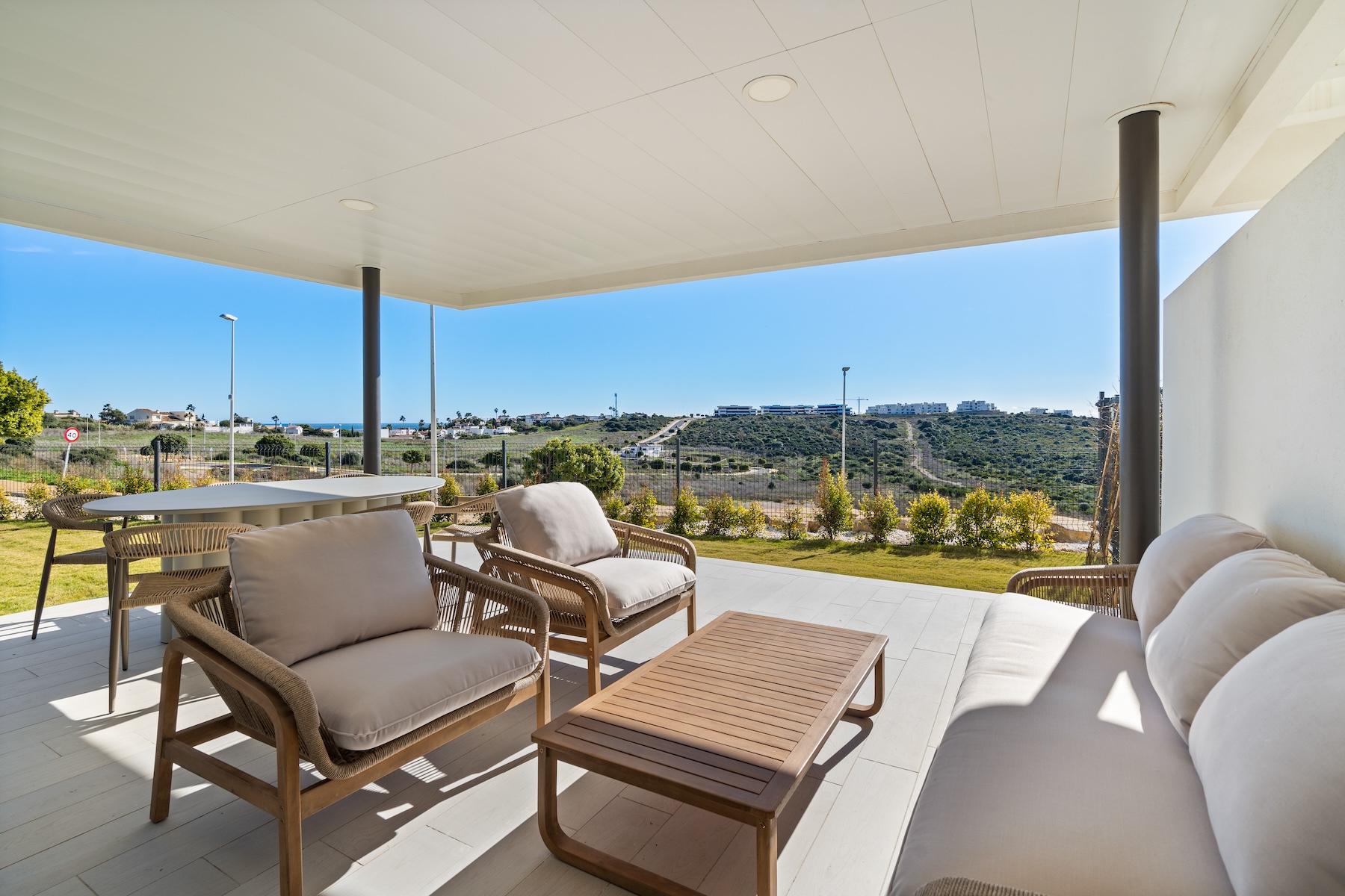 Upon entering the apartment, you are welcomed into a spacious open-plan living and dining area, finished in soft neutral tones and flooded with natural light. The modern, fully equipped kitchen is seamlessly integrated into the space, creating a sociable and practical layout for everyday living. Large sliding doors open directly onto the private garden and the covered terrace, allowing for a smooth indoor–outdoor flow and making the most of the Mediterranean climate year-round. From here, you can enjoy open views over the surrounding landscape, with a pleasant glimpse of the sea, creating a tranquil and inviting setting for both daytime and evening enjoyment.