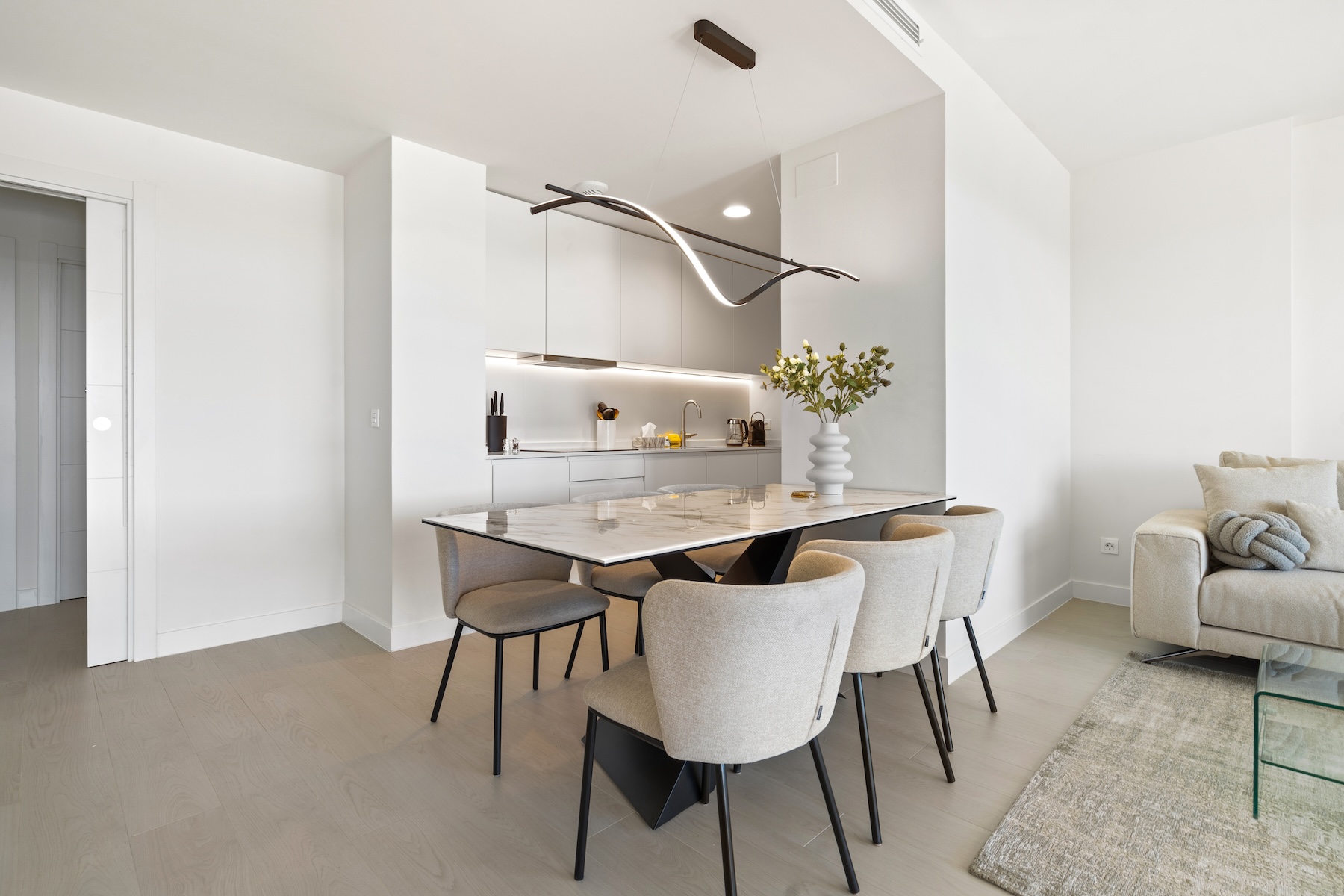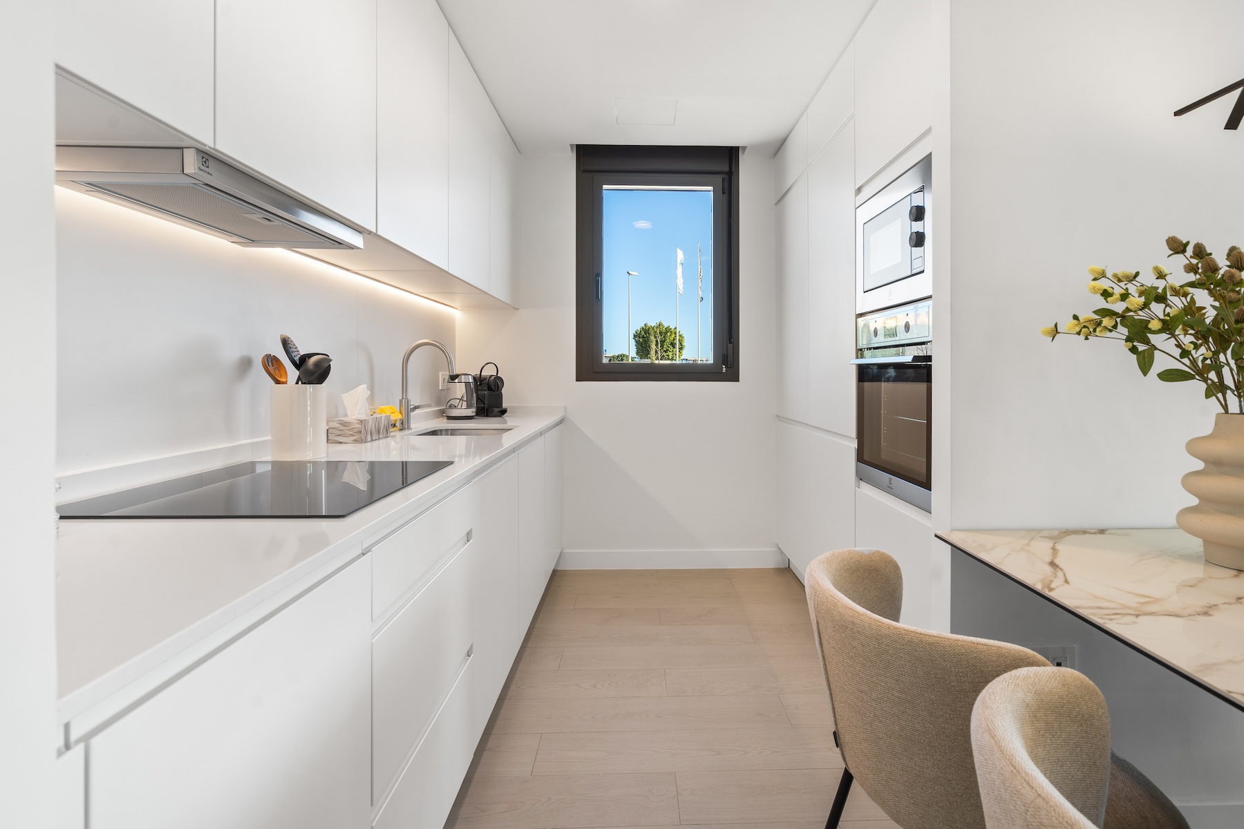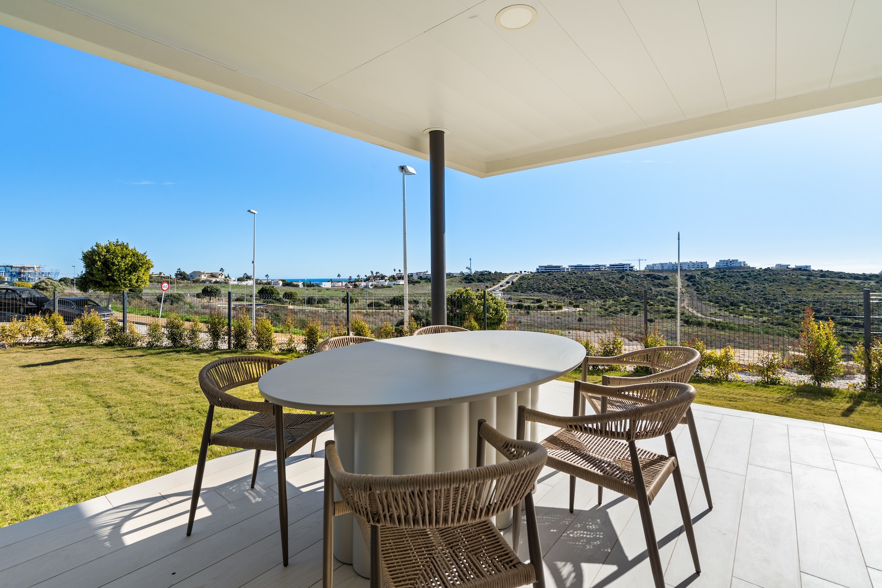 Upon entering the apartment, you are welcomed into a spacious open-plan living and dining area, finished in soft neutral tones and flooded with natural light. The modern, fully equipped kitchen is seamlessly integrated into the space, creating a sociable and practical layout for everyday living. Large sliding doors open directly onto the private garden and the covered terrace, allowing for a smooth indoor–outdoor flow and making the most of the Mediterranean climate year-round. From here, you can enjoy open views over the surrounding landscape, with a pleasant glimpse of the sea, creating a tranquil and inviting setting for both daytime and evening enjoyment.