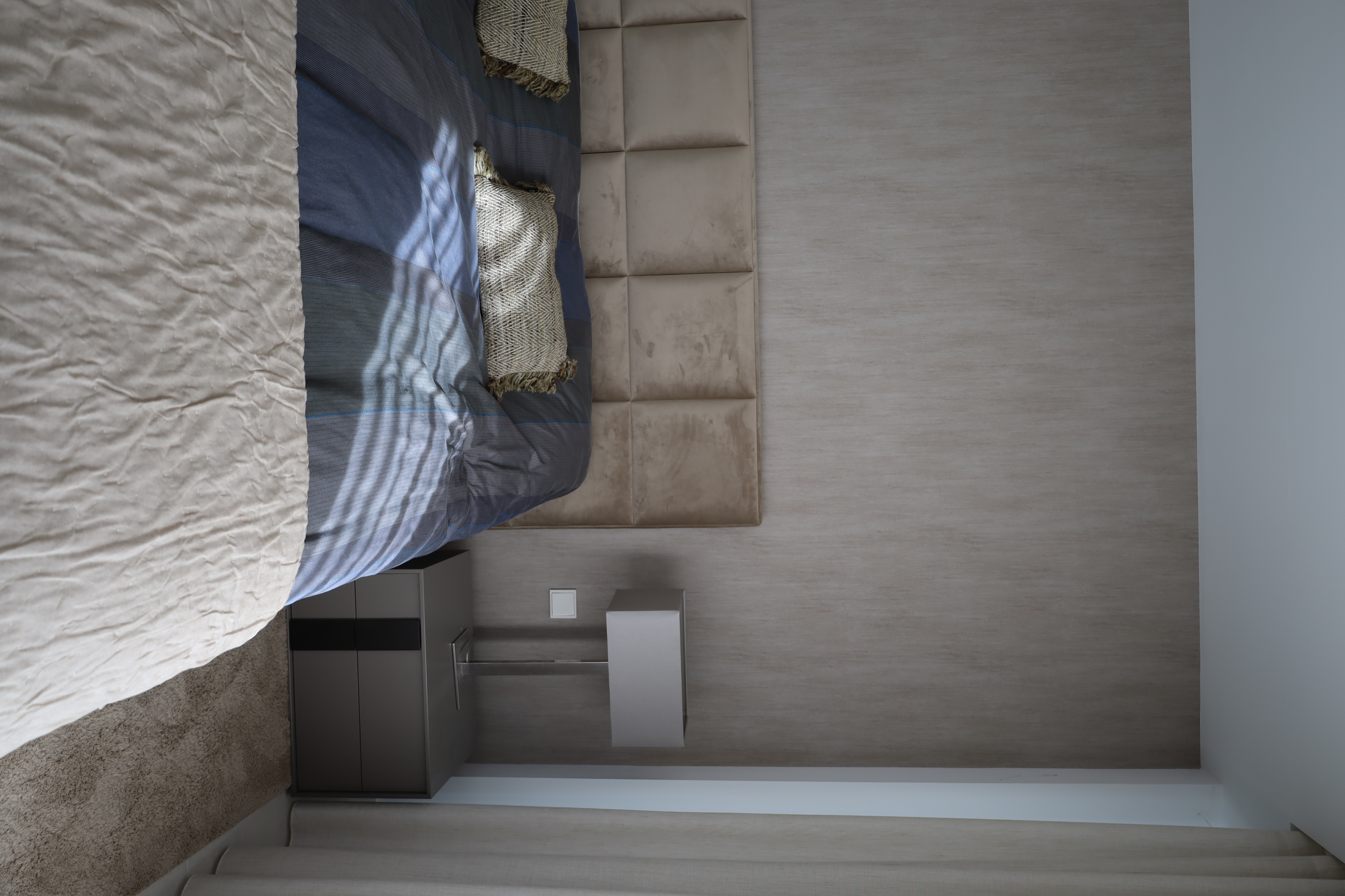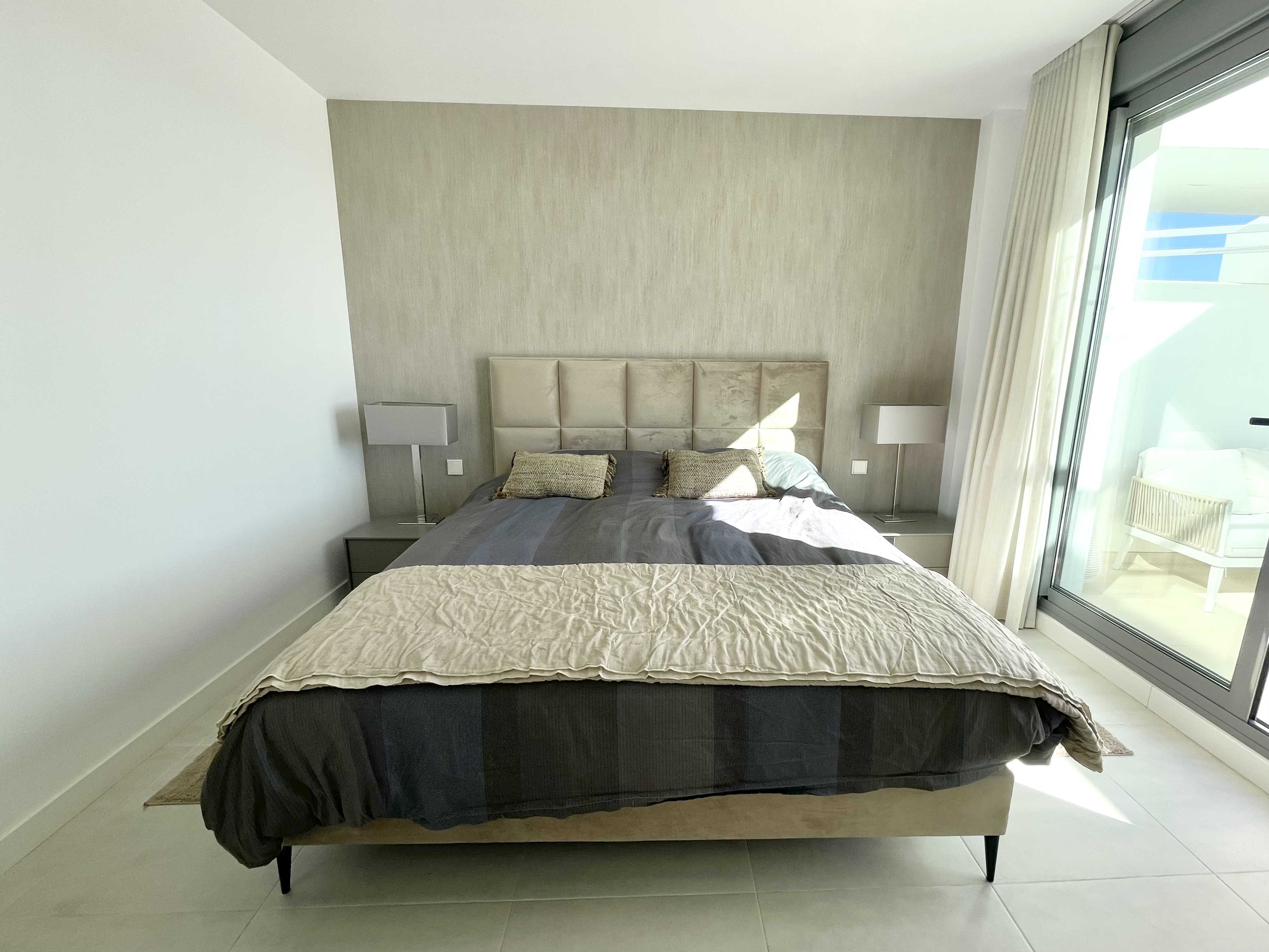 The master suite is a standout feature, filled with natural light and offering another 200cm bed, and direct views toward the terrace. The ensuite bathroom adds a touch of luxury with its walk-in shower and contemporary finishes.