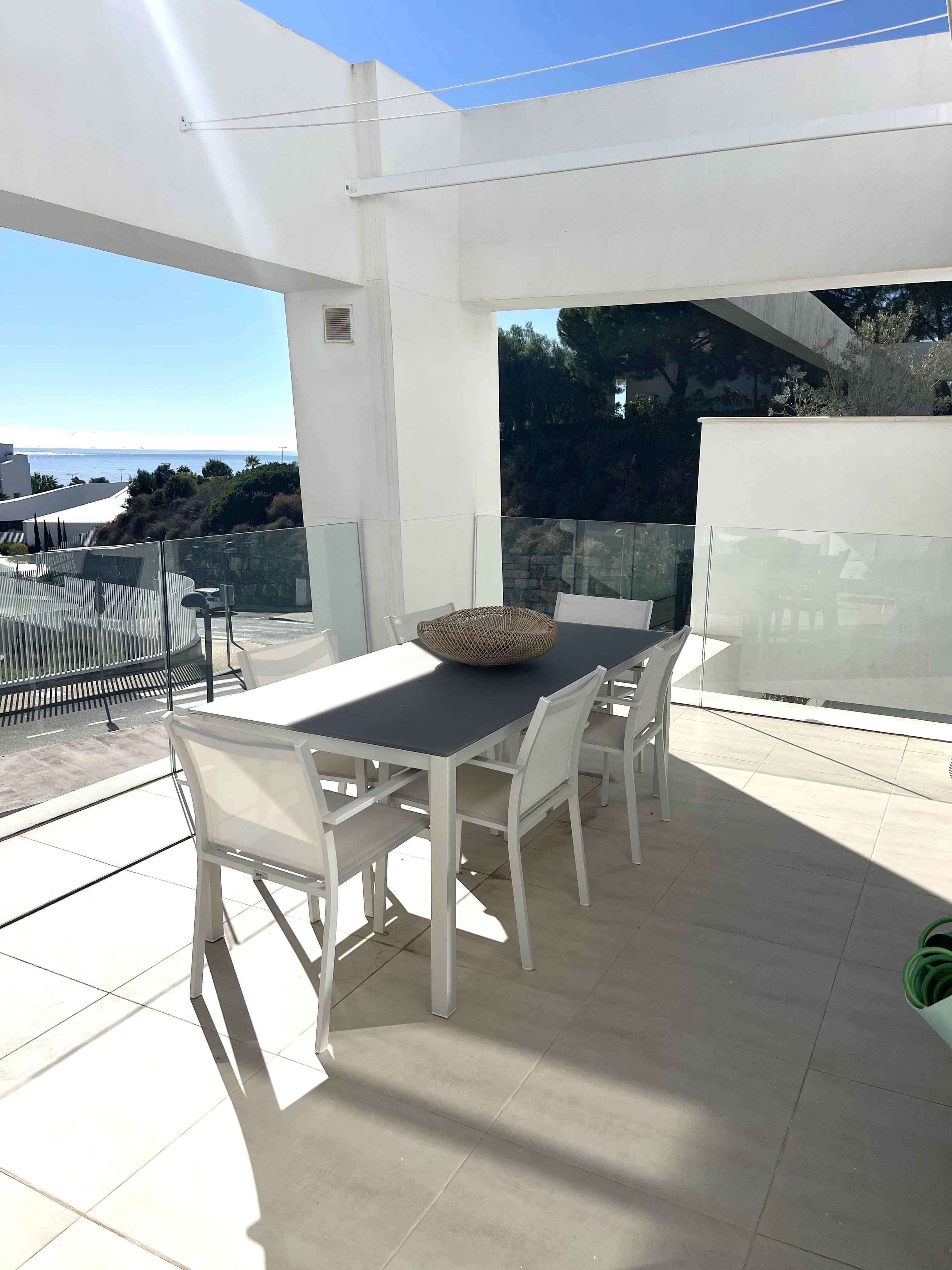 Inside, the open-plan kitchen, dining area, and living room flow seamlessly together, framed by expansive sliding windows that fill the home with natural light. Step out onto the large private terrace, perfect for morning coffee or sunset drinks, with comfortable seating, tranquil garden views, and even a glimpse of the sea.