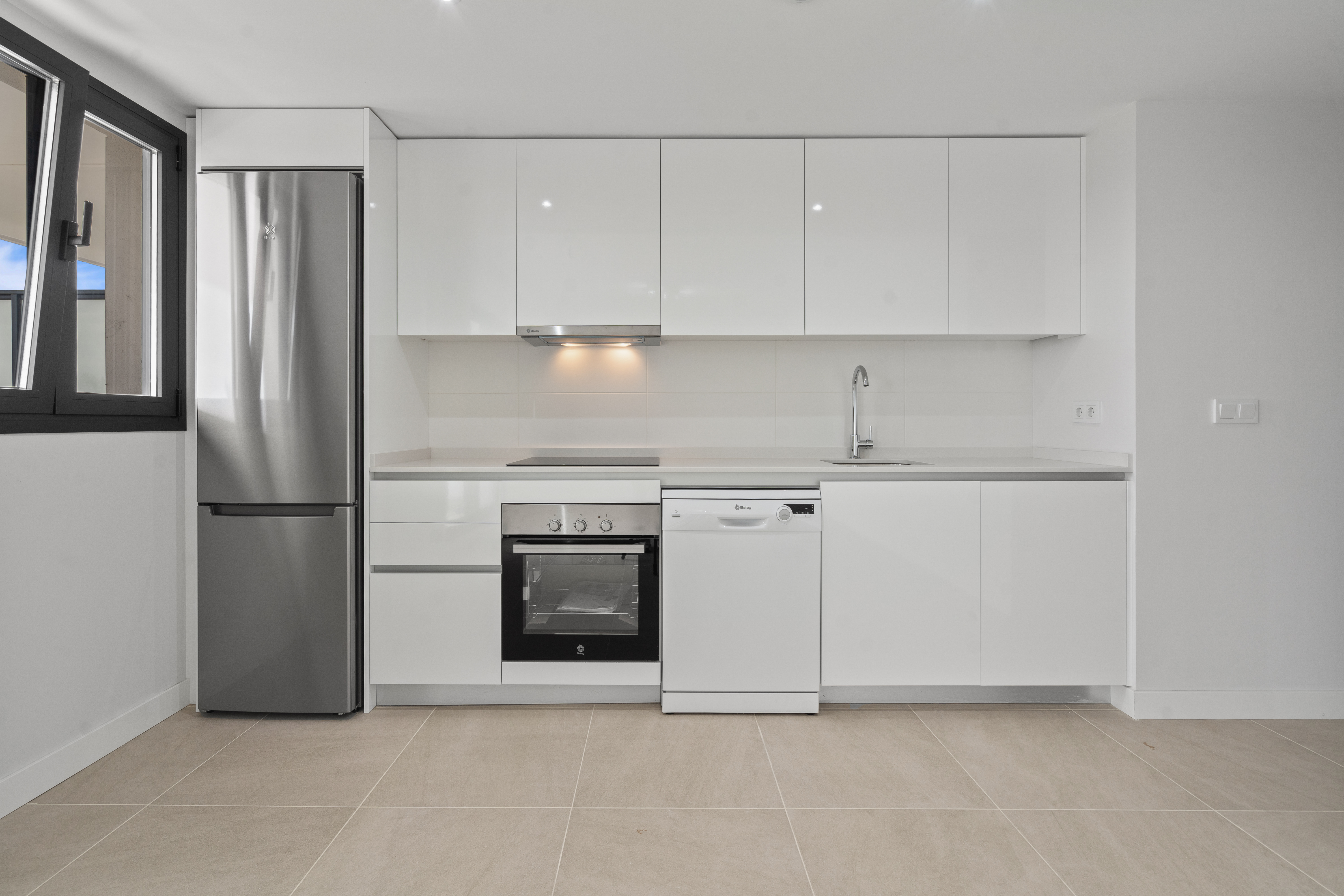 The apartment features a fully equipped kitchen with high-end appliances, including an oven and dishwasher, offering everything you need for comfortable daily living.