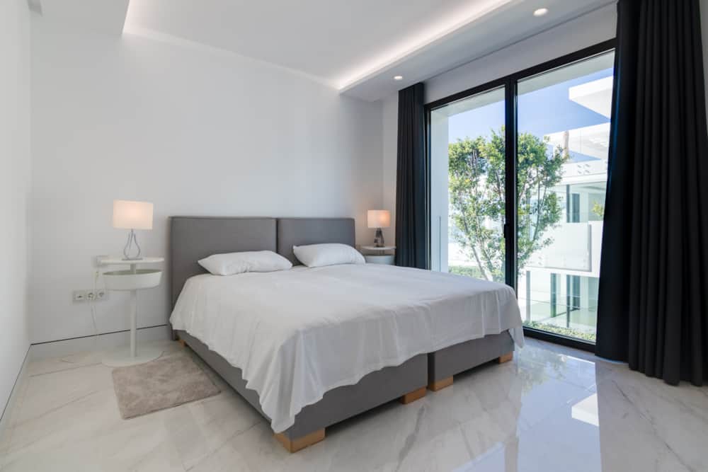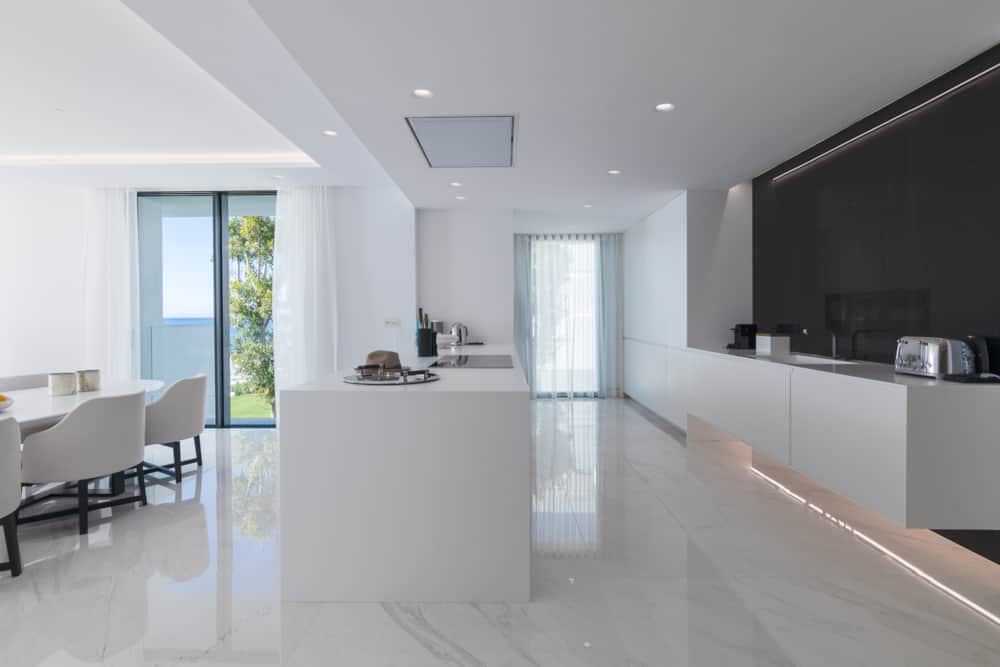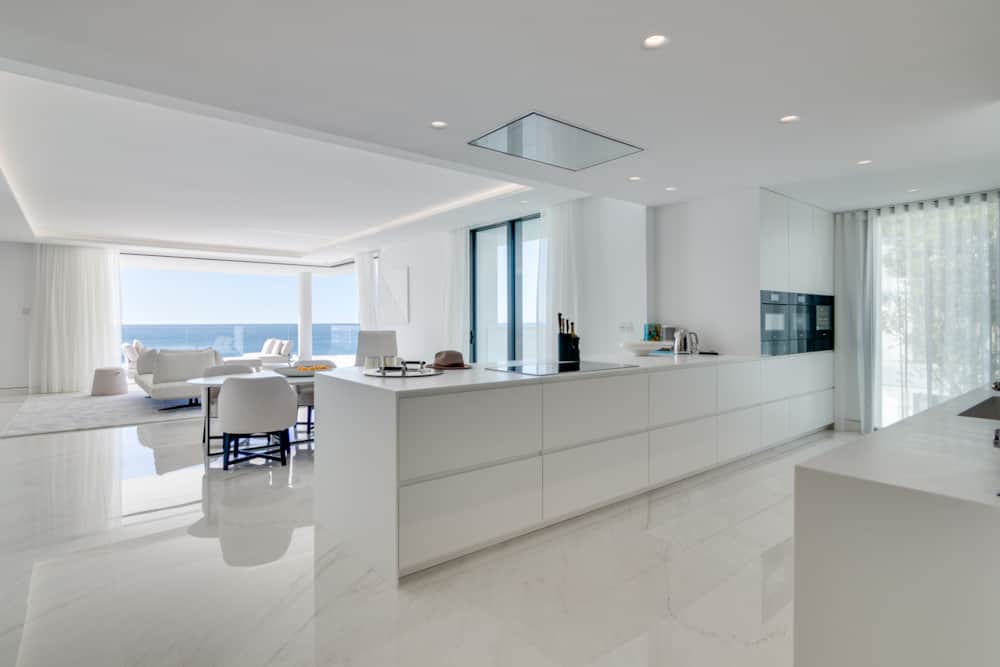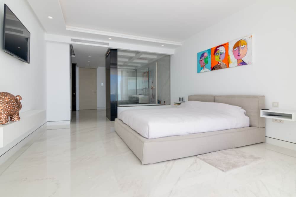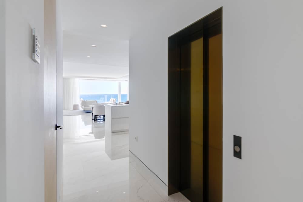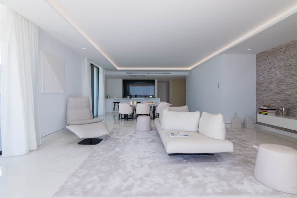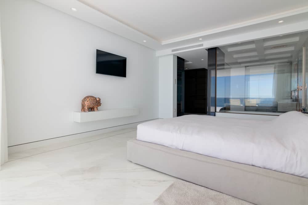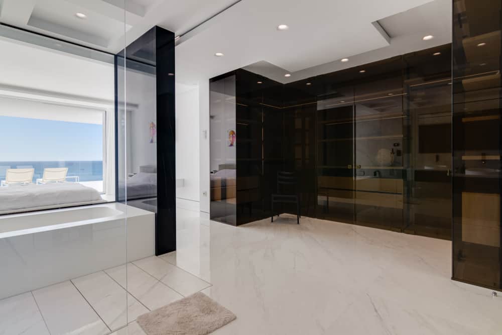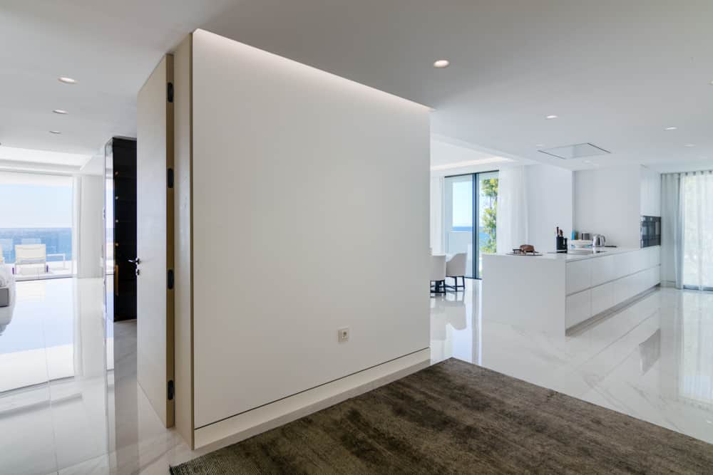 Situated on the first floor, the apartment opens onto a hall with a corridor to 2 guest bedrooms on the right, the open plan kitchen and living room in front, and the doorway to the master bedroom on the left. All rooms have underfloor heating and centralised air conditioning, and all bedrooms have access to their own bathrooms. The master bedroom enjoys access to a bespoke walk-in wardrobe, rainfall shower and Krion design bathtub, all of which, like the rest of the bedroom, has views over the terrace and sea beyond.