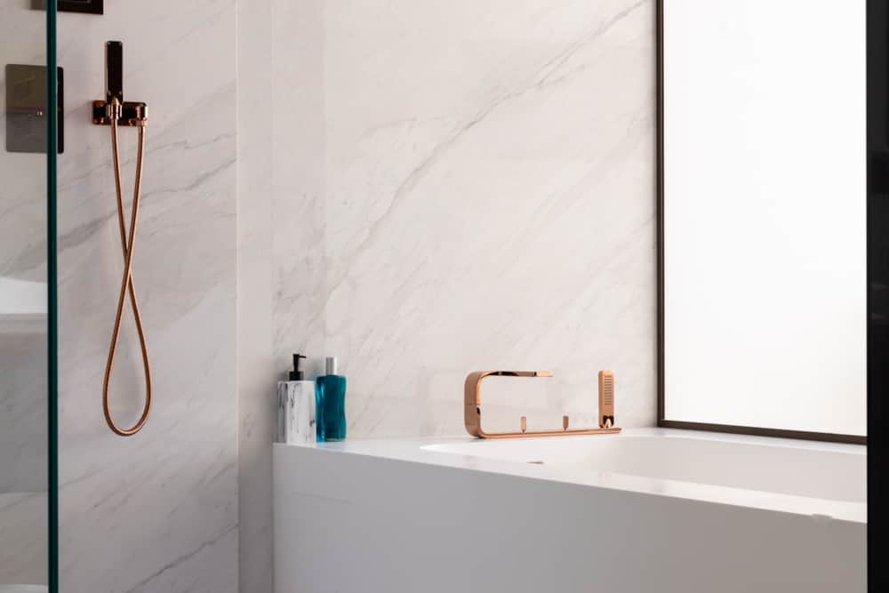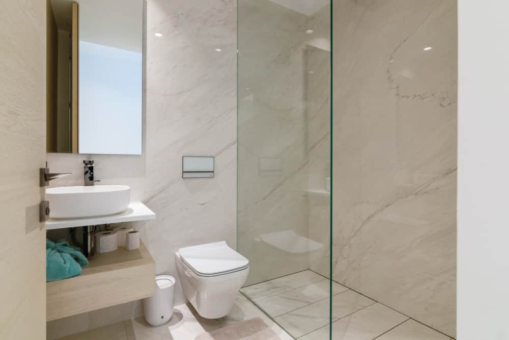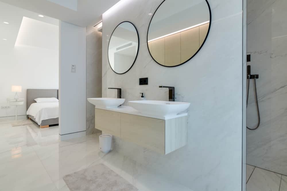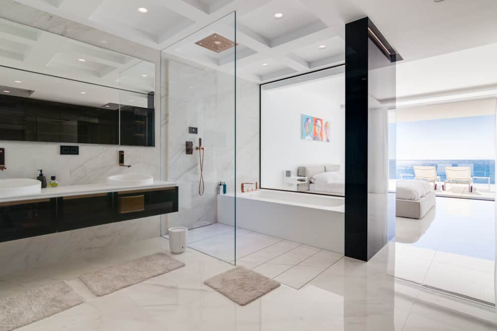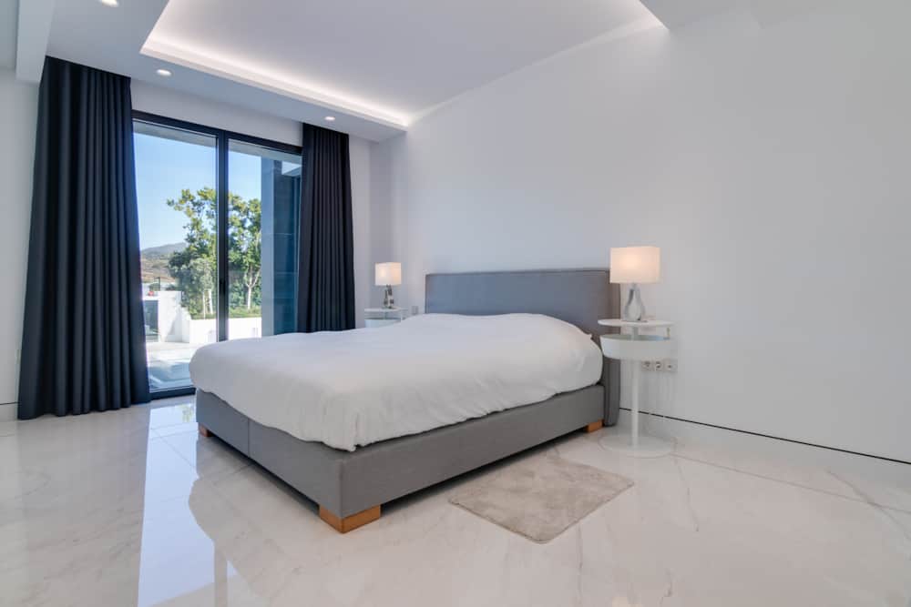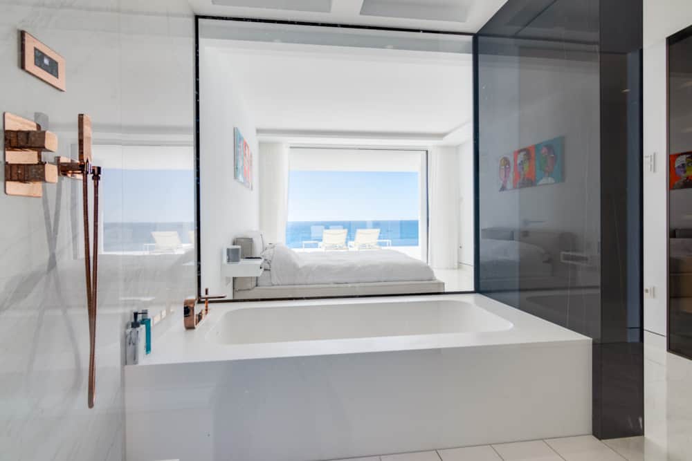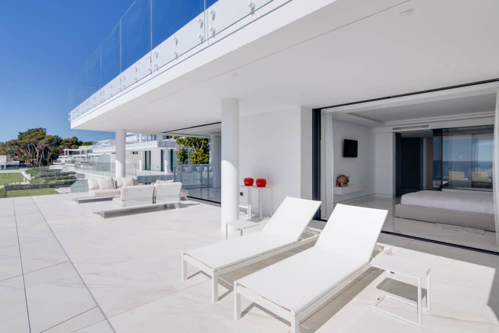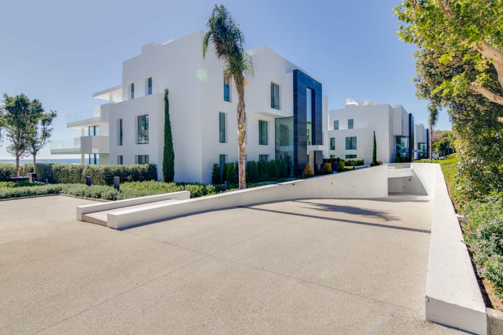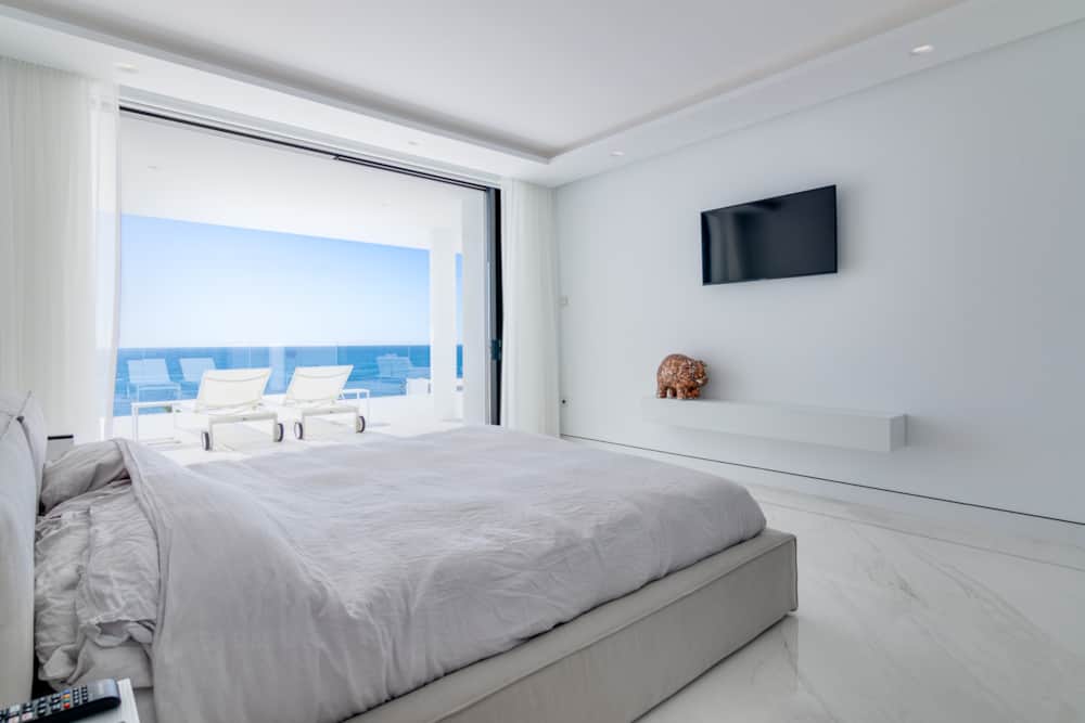 Situated on the first floor, the apartment opens onto a hall with a corridor to 2 guest bedrooms on the right, the open plan kitchen and living room in front, and the doorway to the master bedroom on the left. All rooms have underfloor heating and centralised air conditioning, and all bedrooms have access to their own bathrooms. The master bedroom enjoys access to a bespoke walk-in wardrobe, rainfall shower and Krion design bathtub, all of which, like the rest of the bedroom, has views over the terrace and sea beyond.