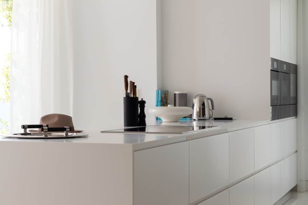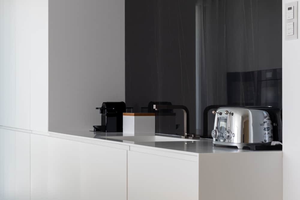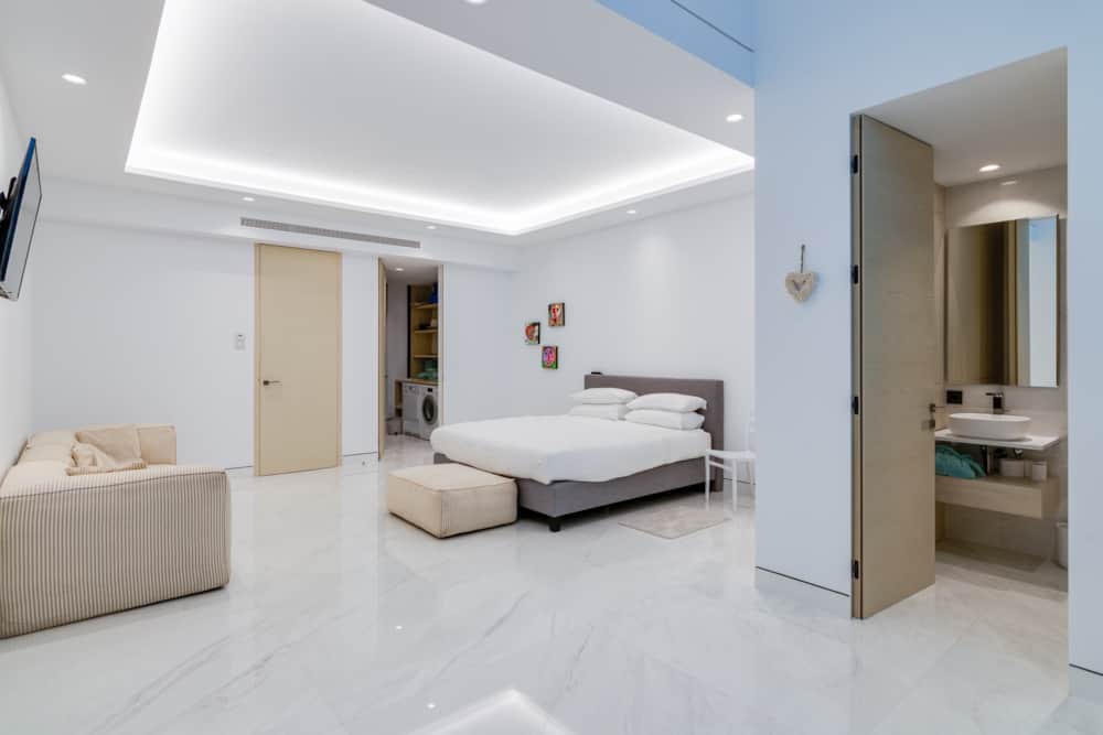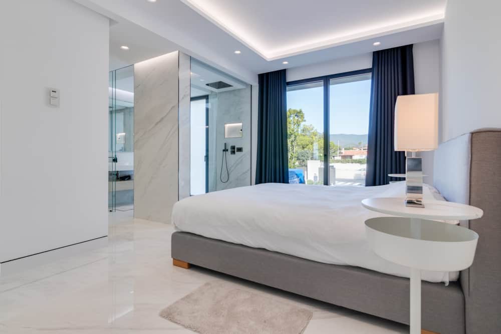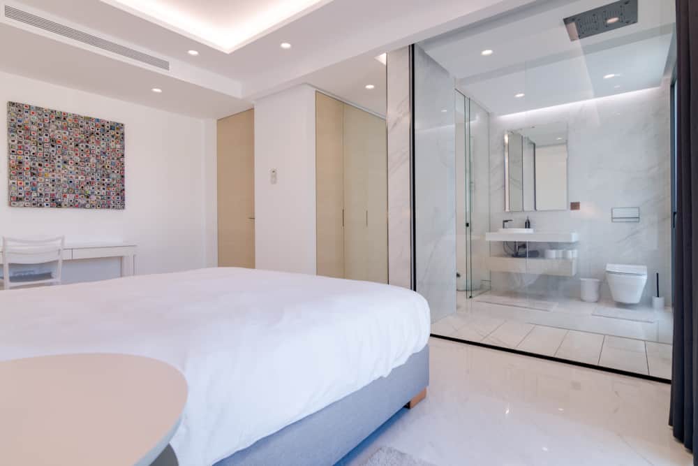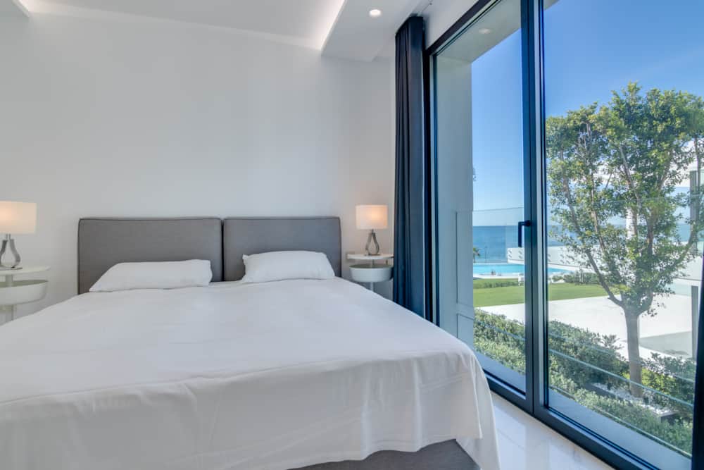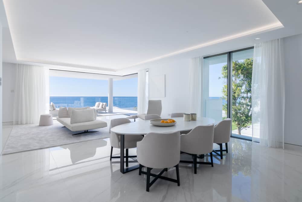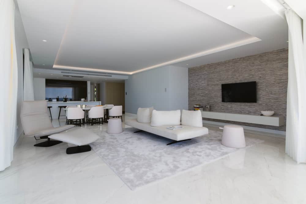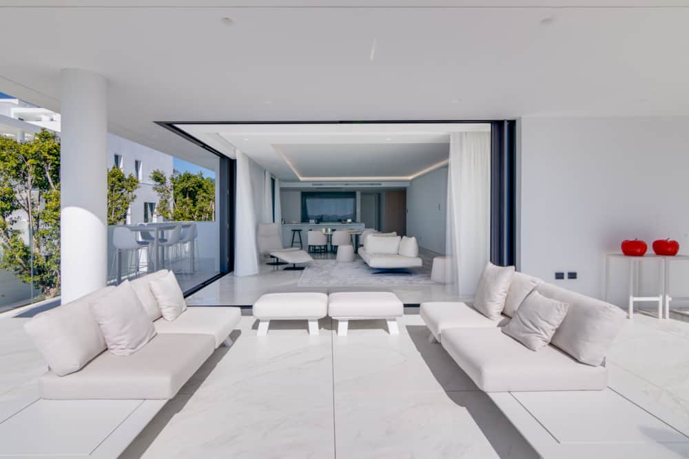 The open plan kitchen is fully equipped with Miele appliances and wine fridge. The living room enjoys an abundance of natural light throughout the day, thanks to the large glass windows that open out onto the terrace. By design, the windows sink entirely into the walls of the living room, integrating the spacious 80m2 terrace with the inside. The terrace commands views over the communal swimming pool and gardens, the beach and the glorious Mediterranean sea. The terrace provides chillout seating, al fresco dining set, as well as private sun loungers.