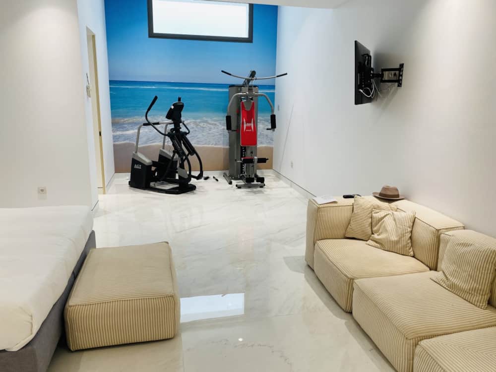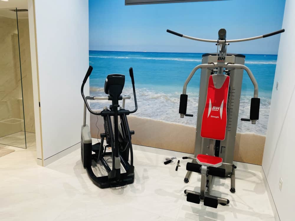 The private lift within the apartment provides access to the downstairs bedroom, which also provides several pieces of gym equipment. Here there is also an attached bathroom (with shower), laundry room (washing machine and tumble dryer), as well as access to the garage with parking for 3 cars.