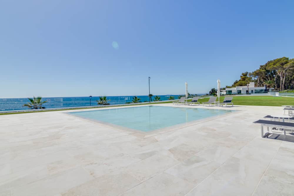 The modern gardens look like an oasis of green against the blue of the sea and the two swimming pools. The salt water pools, one of which is 37 x 9 metres and the other a children’s pool of 9 x 9 metres, take advantage of the latest advancements in outdoor heating (heated all year), and are designed in the infinity pool style, but also provide a shelf area with half sunken sun loungers. Shaded loungers are also provided around the swimming pool. From the garden there is direct access onto the beach.