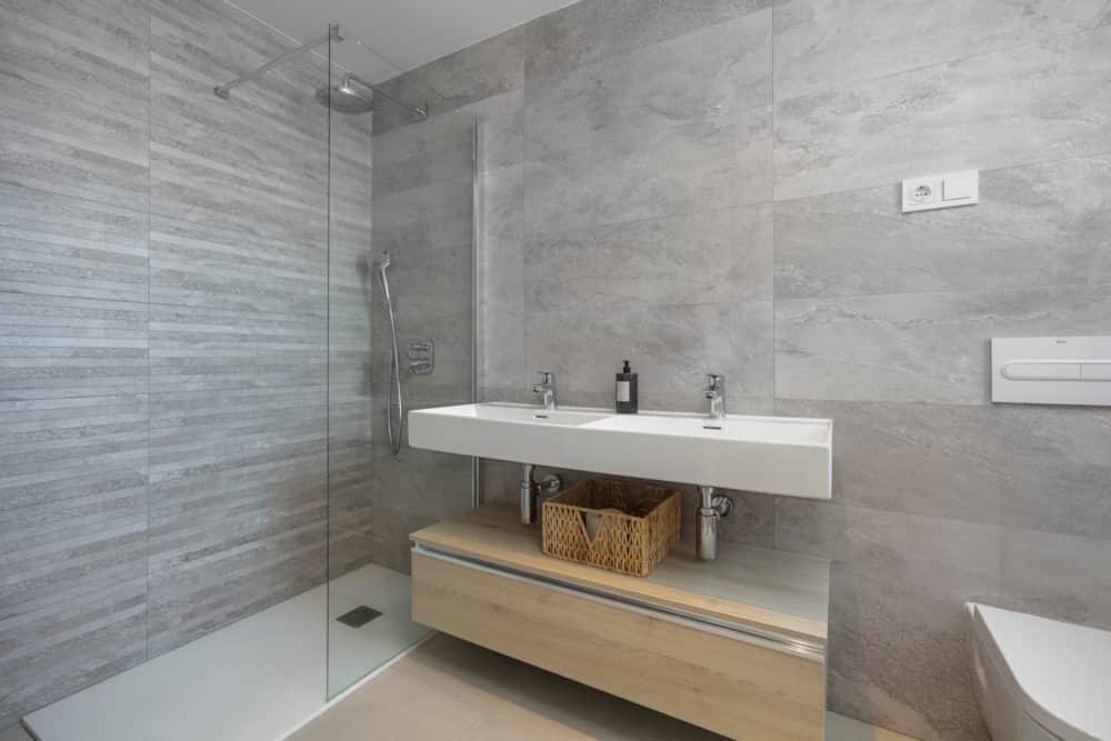 The master bedroom, like the other 3 bedrooms, are fitted with high quality beds. There is a large double bed in the master, and there is access to an ensuite bathroom with double washbasins and walk-in rainfall shower. Two of the guest bedrooms have a double bed, and the third guest bedroom has two single beds. The three bedrooms share access to a bathroom with walk-in shower. A separate w/c is also available located between the bedrooms.