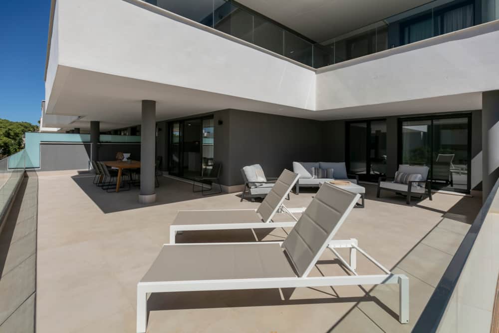 From the living room there is direct access onto the 80m2 private terrace. The terrace is furnished with an alfresco dining area, 2 sun loungers, and chill-out seating. Lovely sea views are visible from the left side of the terrace. Direct terrace access is possible from the living room, master bedroom and neighbouring guest bedroom.