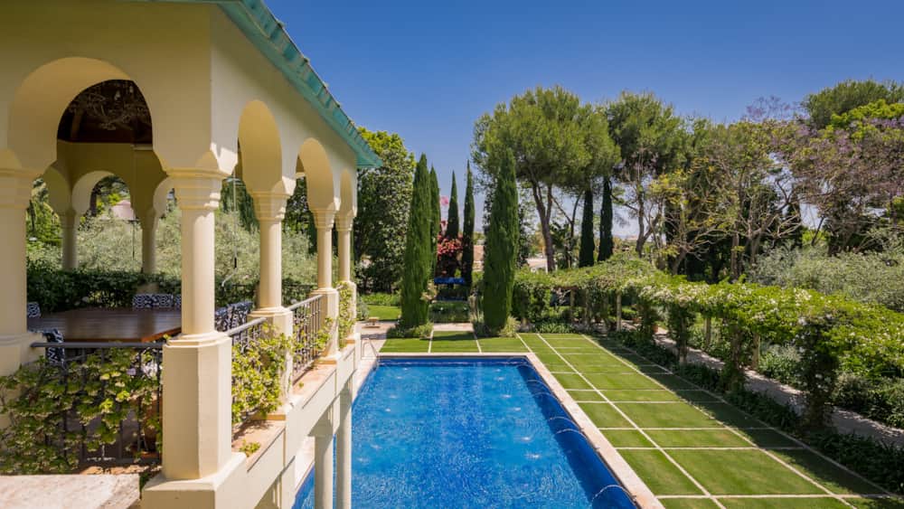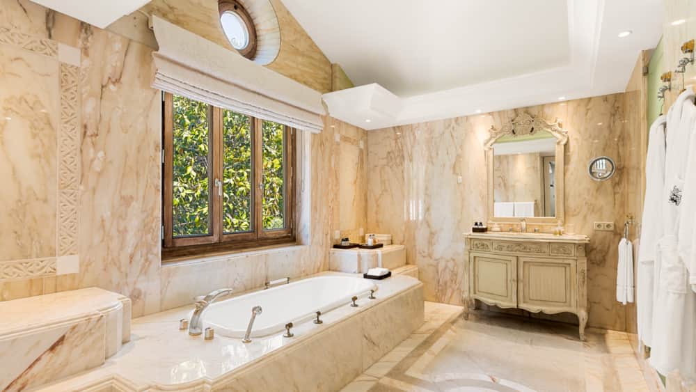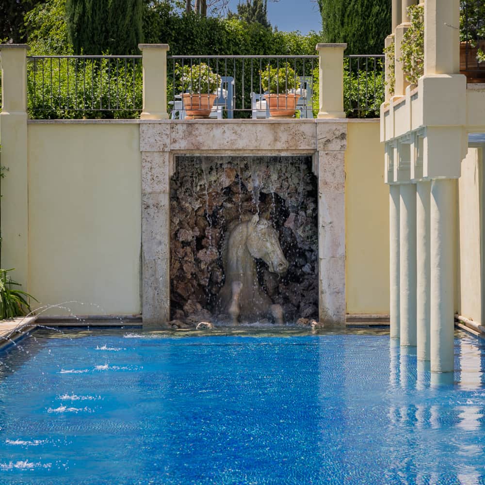 The grounds of the villa are surely one of the property’s main selling points, providing guests with a number of areas to explore and enjoy. The mature gardens host a number of pleasant scents and ensure the villa’s privacy is maintained, while the manicured lawns are perfect for fun and games with the children. The grounds have several different areas for relaxing in the sun, which include a covered al-fresco dining area, tennis pavilion, and private tennis court. The large ornate swimming pool, complete with hand carved stone horse sculpture, is perfect for a refreshing dip, while the heated swimming pool located next to the main house, ensures guests can get in the water even during the colder months.