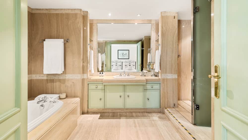 - Bedroom Two: Green Room: Two twin beds, Ensuite bathroom with Tub, Shower and single Vanity.
