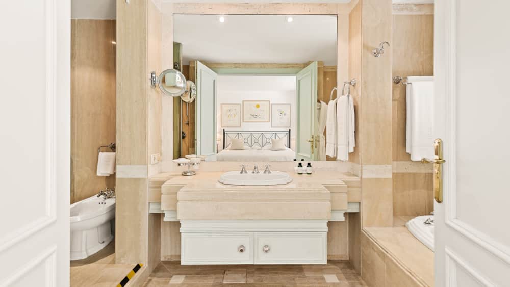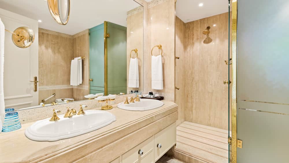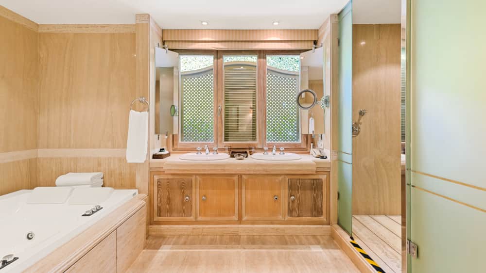 - - Bedroom Two – Cream Room: Two twin beds (can be converted to Double) Ensuite bathroom with Tub, Shower and Single Vanity