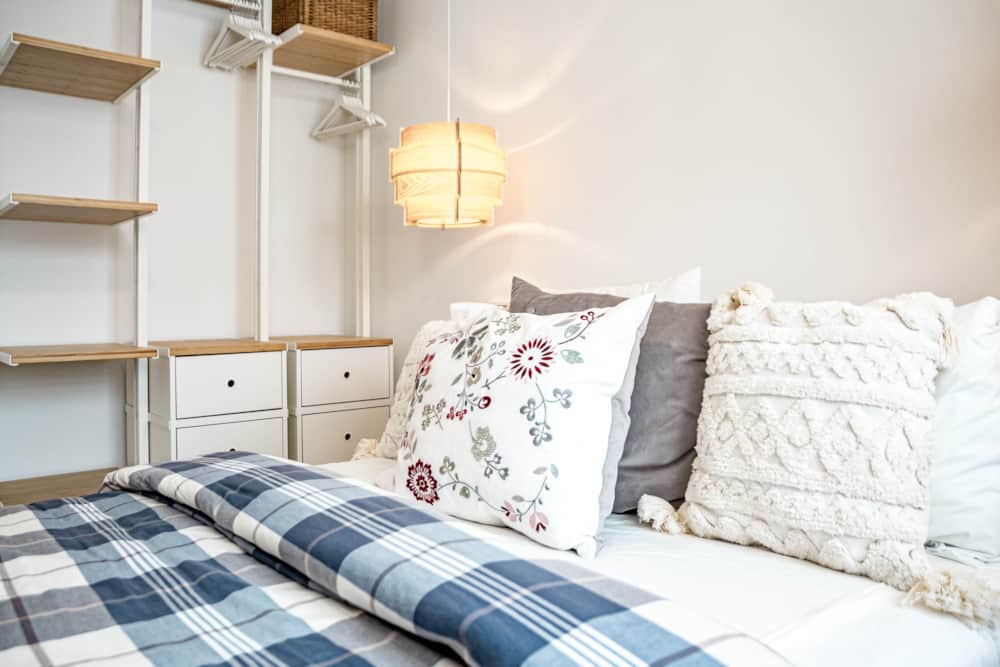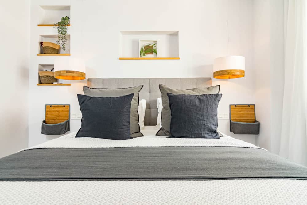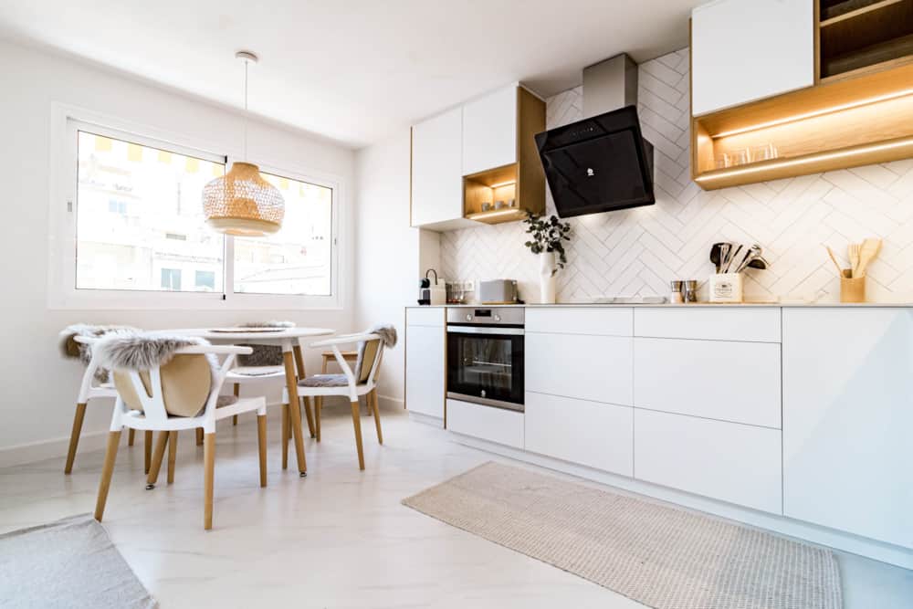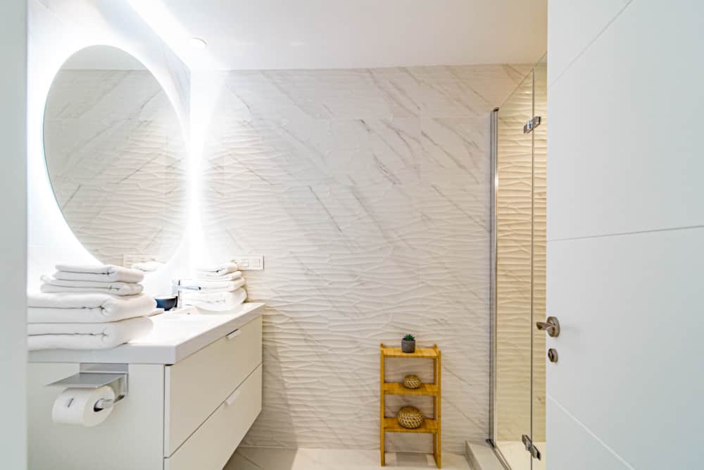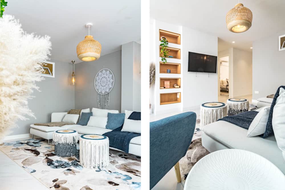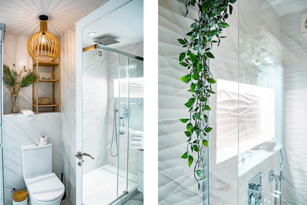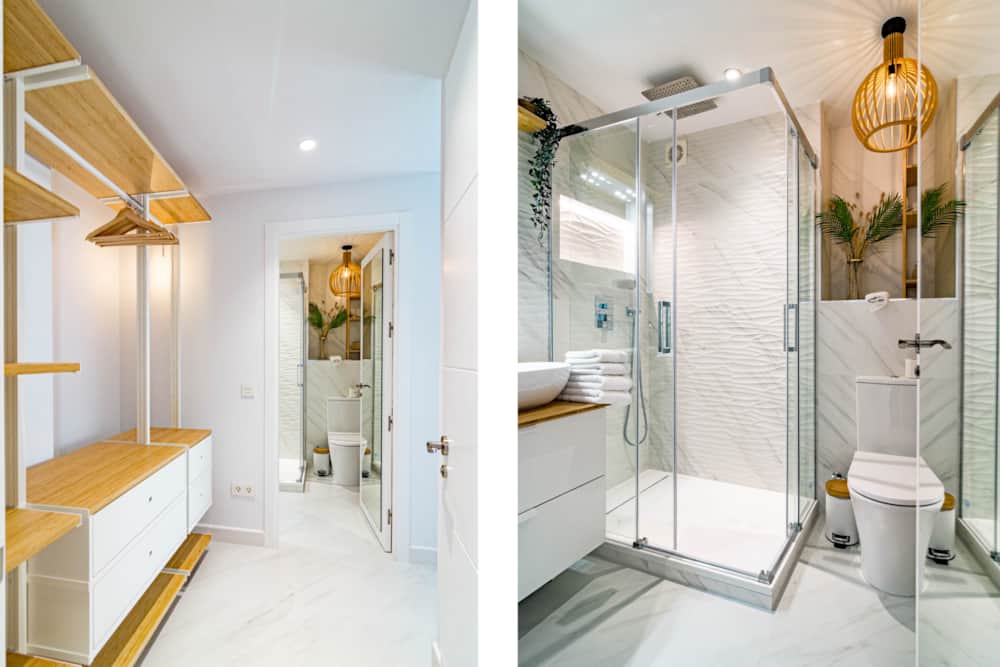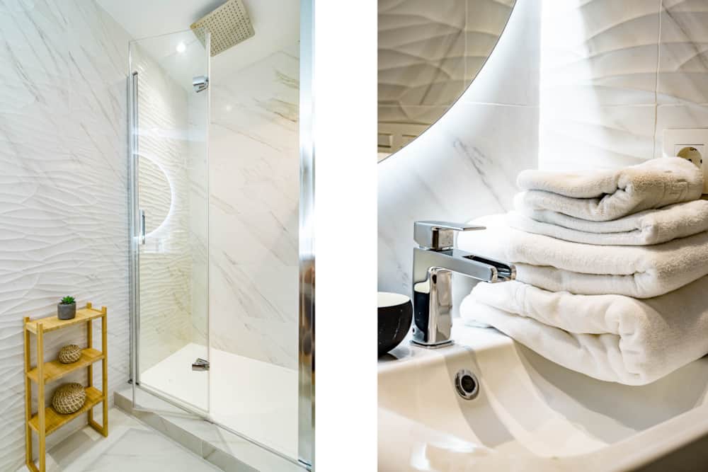 The living room is well furnished with a large L-shaped sofa and armchair facing a smart TV hung on the wall (Netflix, Amazon Prime etc). The living room opens onto the property’s spacious private terrace, which provides alfresco dining and chillout seating areas. The terrace looks over one of Estepona’s Old Town streets, which is dotted with traditional restaurants, bars and cafes.