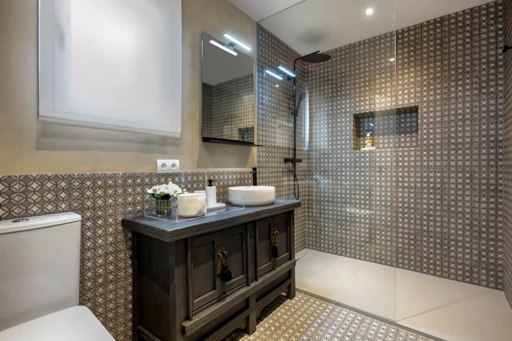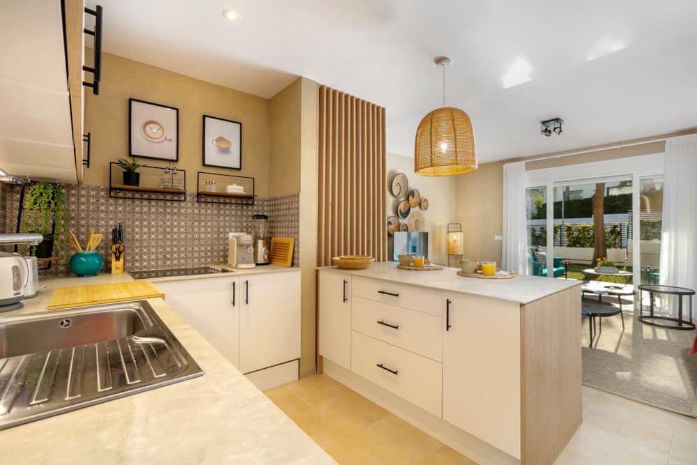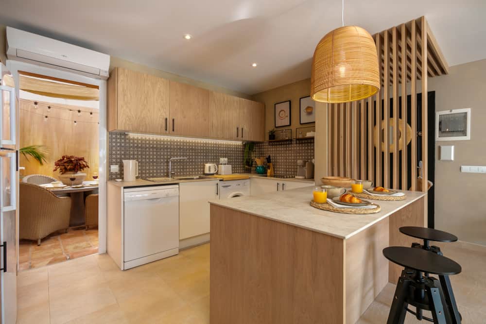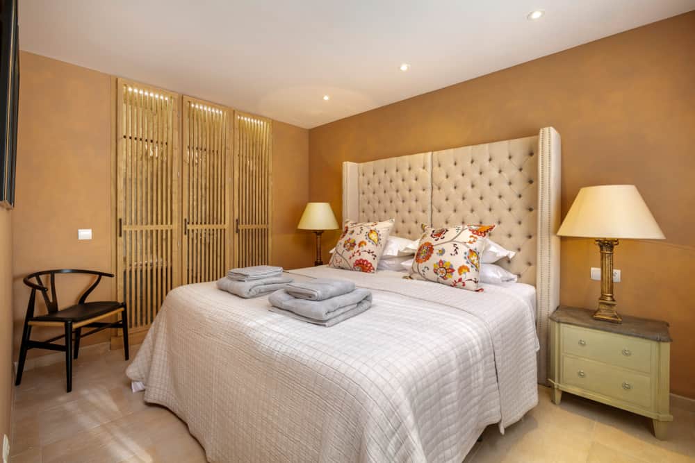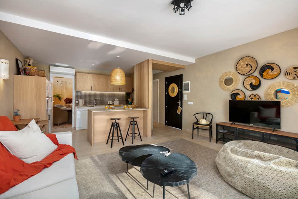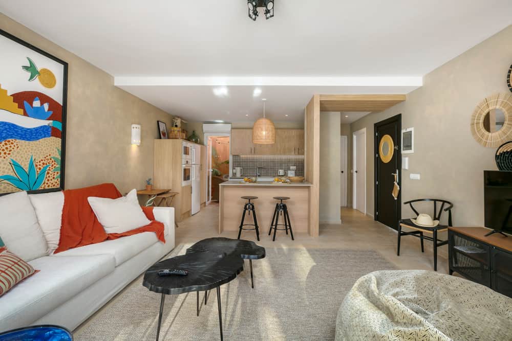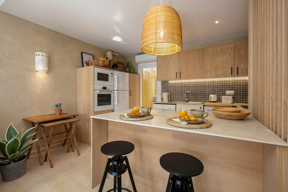 Through the front door guests will find the bedroom and bathroom on the right, the living room and main terrace on the left, and the open plan kitchen and secondary terrace in front. The bedroom provides a queen size bed, plenty of storage space, and individual air conditioning unit (hot and cold). The bathroom has been entirely remodelled, providing a large walk-in shower with beautiful tiling.