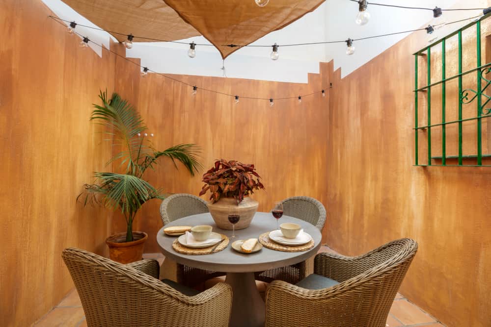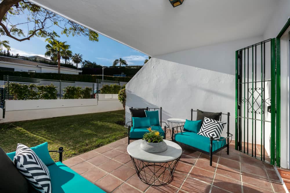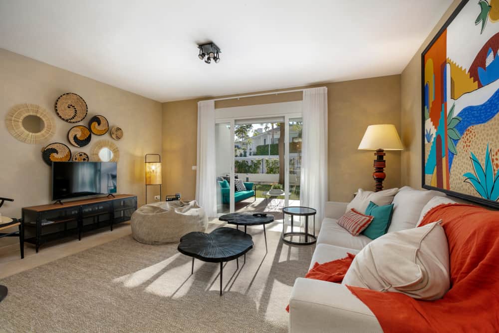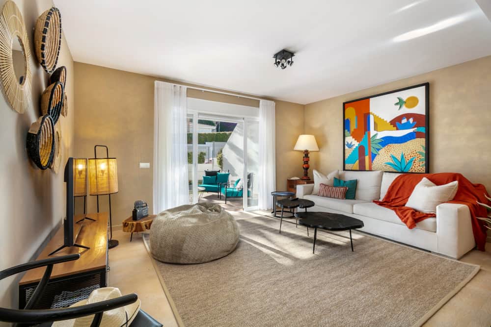 The spacious living room is colourful and well furnished, providing a large and comfortable sofa, smart TV (Netflix, Amazon Prime etc) and IPTV system (international channels). From the living room guests have direct access onto the covered terrace, furnished with exterior sofa and chairs. All windows of the property are barred and have shutters for security and also to block out any noise at night.