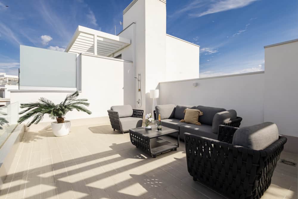 Outside on the first terrace guests will find an alfresco dining area (seating for 6) and a gas barbecue. Upstairs (spiral staircase) there is chillout seating, perfect for watching the sunset and enjoying the amazing views that the apartment offers.