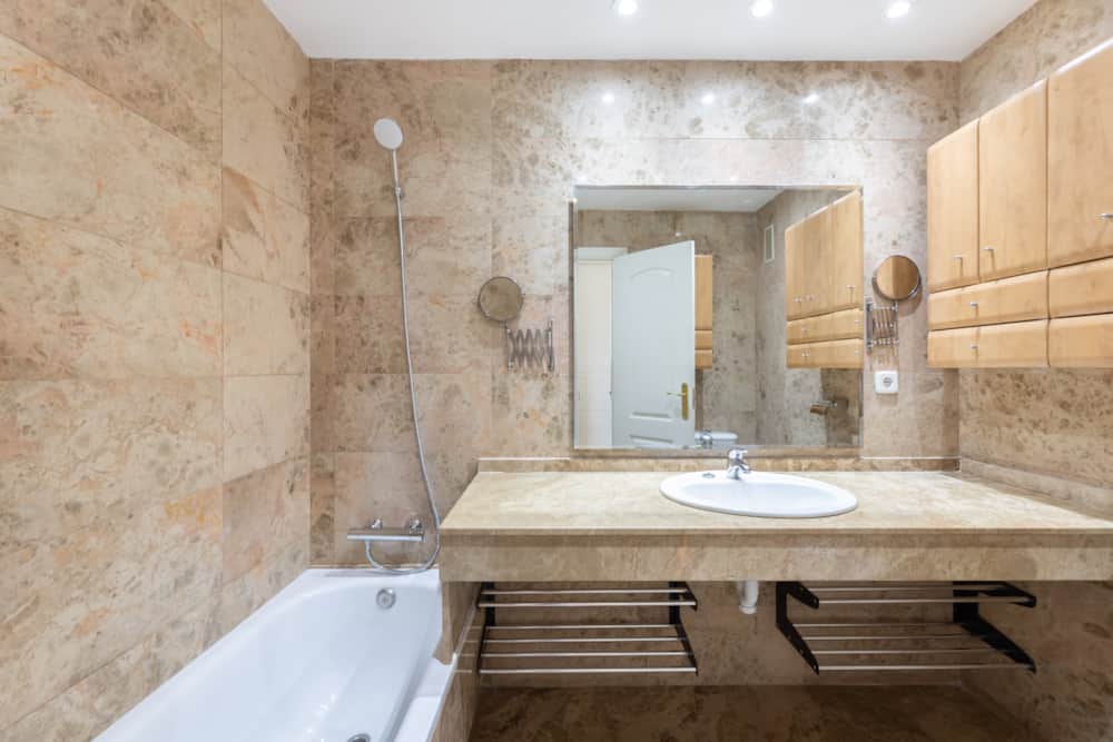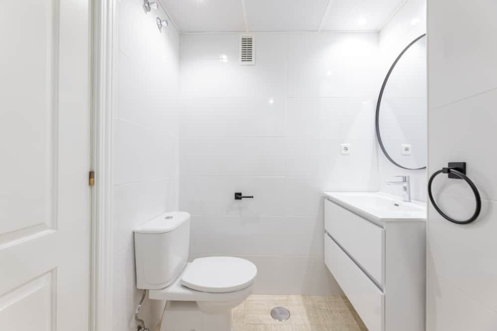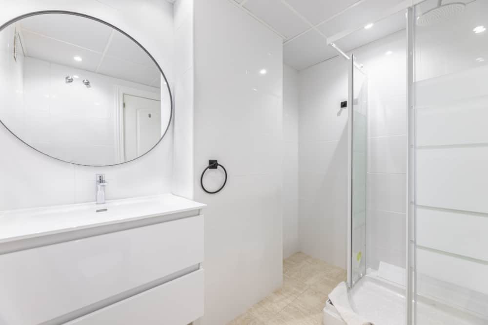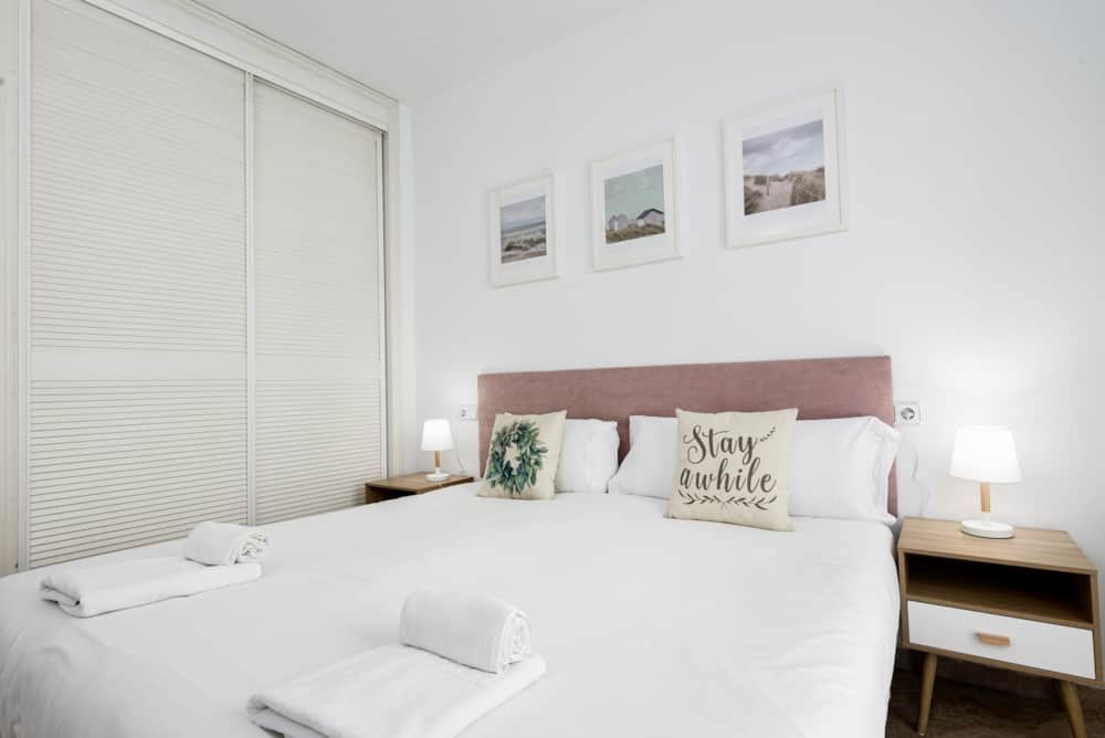 The master bedroom offers a large double bed, direct access onto the apartment’s terrace, plenty of storage space, and an ensuite bathroom with bath/shower. The guest bedroom has two single beds and access to the renovated guest bathroom with walk-in shower.