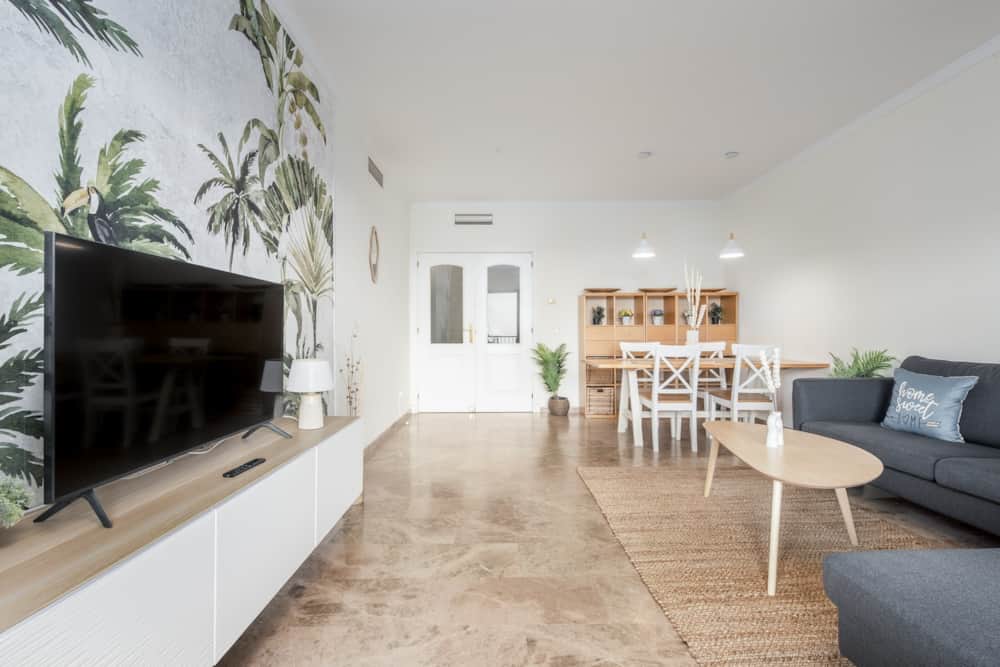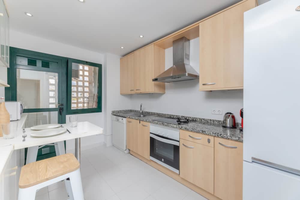 The kitchen is well equipped with all the appliances and utensils expected of a quality rental property, perfect for those guests that enjoy cooking and entertaining. From the kitchen, guests will find the living room, which features a dining area (seating for 4), and a comfortable L-shaped sofa facing a smart TV (Netflix, Amazon Prime etc). The living room gets plenty of natural light through the large south facing windows that lead to the apartment’s private terrace. Here guests will find an alfresco dining area and chillout seating, from where they can enjoy views of the beautiful pool and gardens of the community below, and the blue Mediterranean sea in the distance.