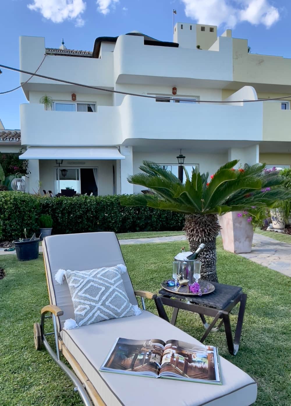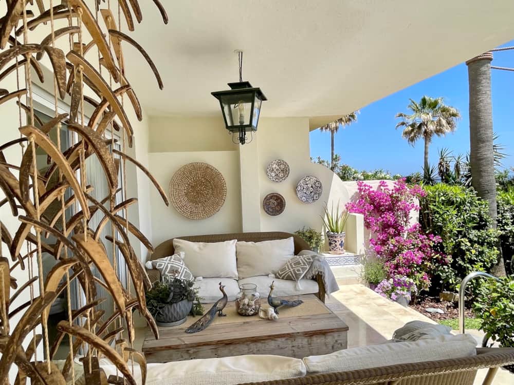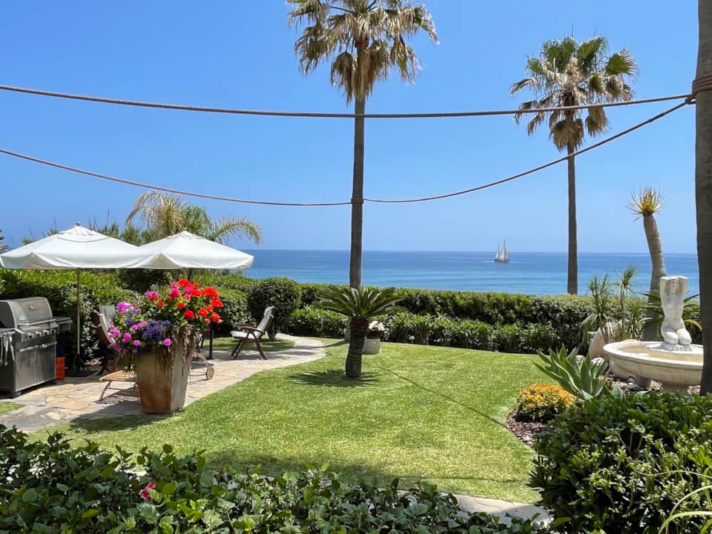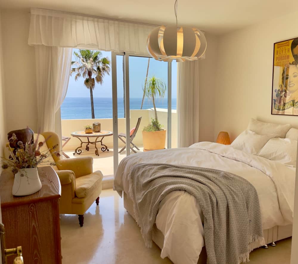 On the ground floor guests will find the fully equipped kitchen and living room. The kitchen has everything expected of a quality holiday rental property, perfect for those guests that’s enjoy cooking and entertaining. From the kitchen, guests will find the dining area, and the living room furnished with a comfortable sofa facing a smart TV (Netflix, Amazon Prime). The ground floor terrace is accessible through the large sliding doors of the living room, which present guests an alfresco dining area and chillout seating. In the property’s private garden guests will find a manicured lawn and blooming flowers against the blue background of the Mediterranean sea. Here there is a gas BBQ, additional seating and chairs, and sun loungers. From the garden guests have gated direct access onto the beach promenade, which provides a lovely walking route to Estepona and nearby beach bars/restaurants along the seafront.