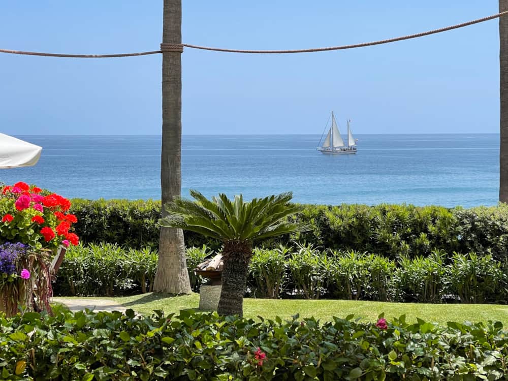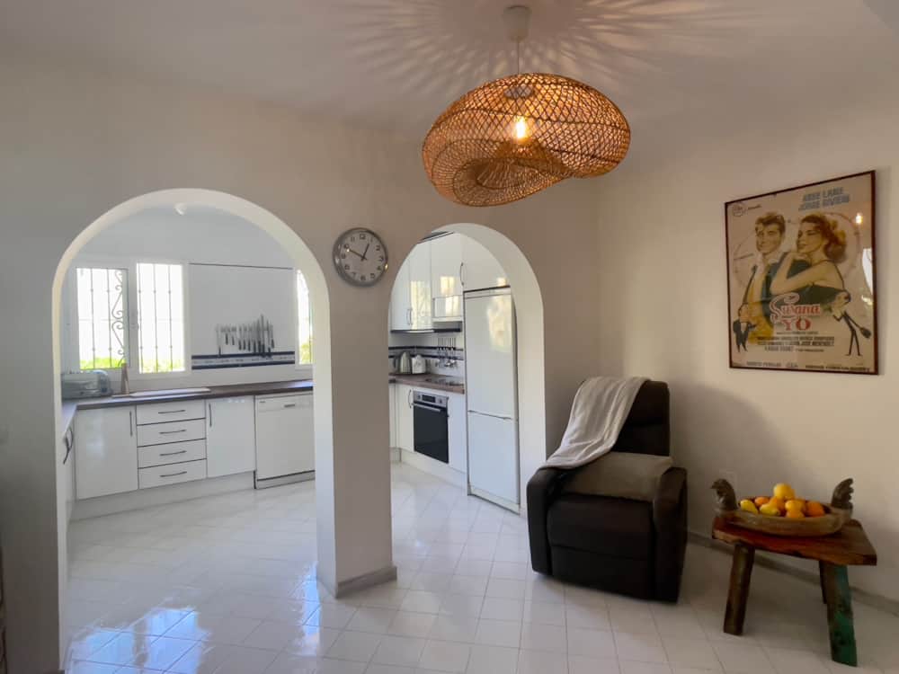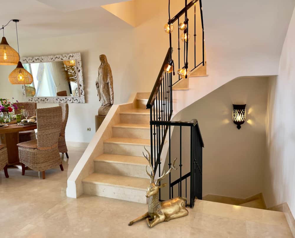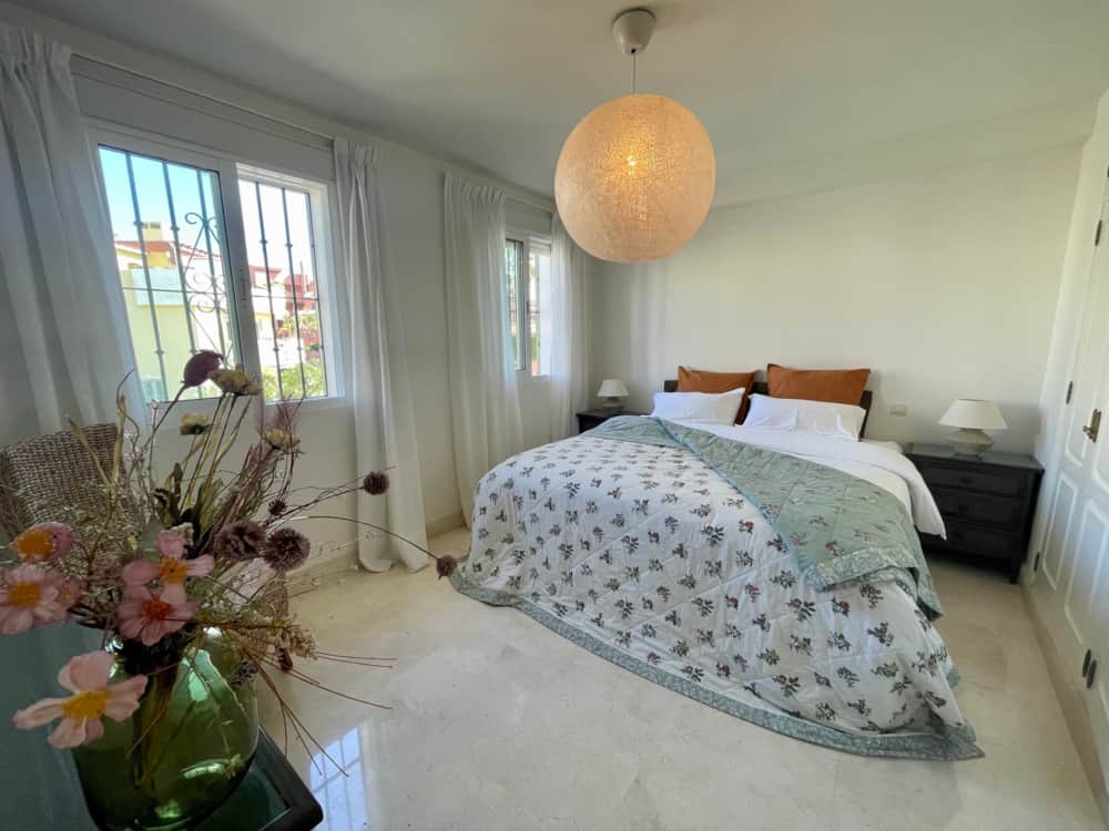 On the ground floor guests will find the fully equipped kitchen and living room. The kitchen has everything expected of a quality holiday rental property, perfect for those guests that’s enjoy cooking and entertaining. From the kitchen, guests will find the dining area, and the living room furnished with a comfortable sofa facing a smart TV (Netflix, Amazon Prime). The ground floor terrace is accessible through the large sliding doors of the living room, which present guests an alfresco dining area and chillout seating. In the property’s private garden guests will find a manicured lawn and blooming flowers against the blue background of the Mediterranean sea. Here there is a gas BBQ, additional seating and chairs, and sun loungers. From the garden guests have gated direct access onto the beach promenade, which provides a lovely walking route to Estepona and nearby beach bars/restaurants along the seafront.