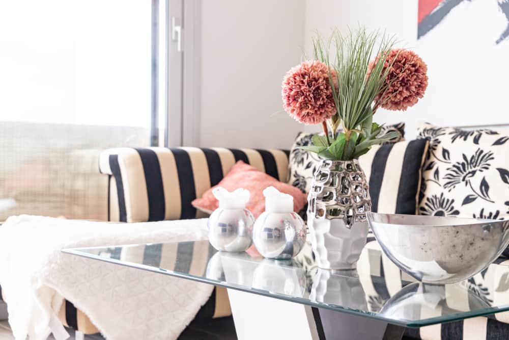 The living room is bathed in natural light through the terrace’s sliding windows. The south facing terrace is furnished with an alfresco dining area, and 2 sun loungers,where you can relax and enjoy the beautiful view of the Mediterranean Sea.